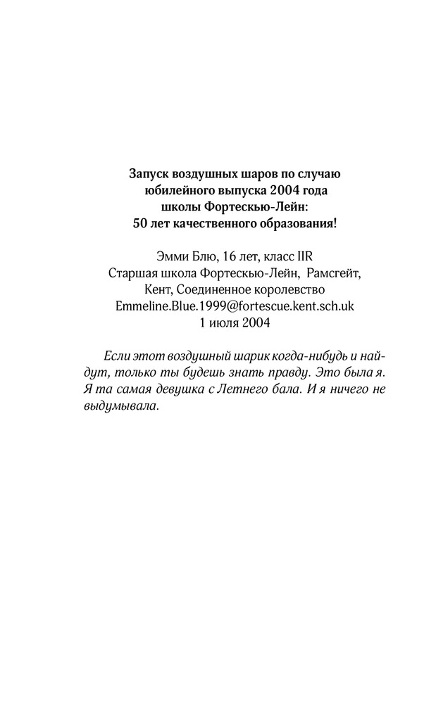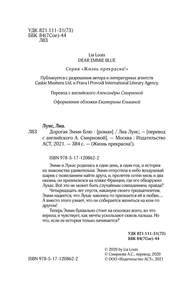 Дорогая Эмми БлюВ данный момент этот товар отсутствует в продаже. Возможно, у нас найдется аналогичный или похожий товар здесь. Серия: Жизнь прекрасна Эмми и Лукас родились в один день, в один год, и история их знакомства удивительна: Эмми отпустила в небо воздушный шарик с пожеланием найти друга, и, пролетев сотни миль и два океана, он приземлился на пляже Франции, где его обнаружил Лукас. Всё это не может быть случайным совпадением, правда? |