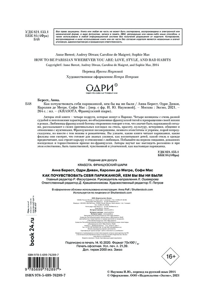 Как почувствовать себя парижанкой, кем бы вы ни былиВ данный момент этот товар отсутствует в продаже. Возможно, у нас найдется аналогичный или похожий товар здесь. Серия: #Одри.Style Авторы этой книги — четыре подруги, которые живут в Париже. Четыре женщины с очень разной судьбой и непохожими характерами, но объединенные французской тягой к превращению своей жизни в роман. Любимицы французской богемы откровенно говорят о том, что значит быть парижанкой сегодня, рассказывают о своих оригинальных взглядах на стиль, красоту, культуру, вечеринки, общение и отношения с мужчинами. Француженки несовершенны, немного эгоистичны и упрямы, порой непредсказуемы, но вместе с тем нежны и романтичны. Вы узнаете какие книги читают парижанки, какие фильмы они смотрят, что готовят для званых ужинов, как воспитывают детей, какой стиль в одежде предпочитают, как строят карьеру и отношения с любимым. Побывайте на первом свидании, домашних посиделках и торжественном приеме по-французски. Авторы научат вас выглядеть роскошно и при этом естественно , быть таинственной, чувственной, и утонченной, как настоящая парижанка. |