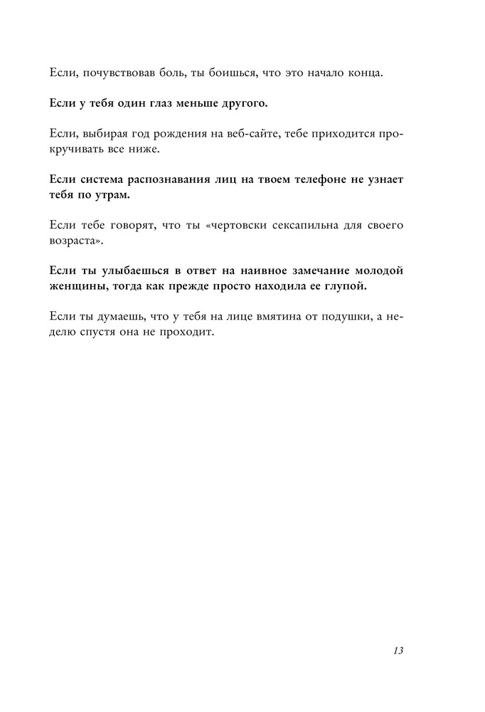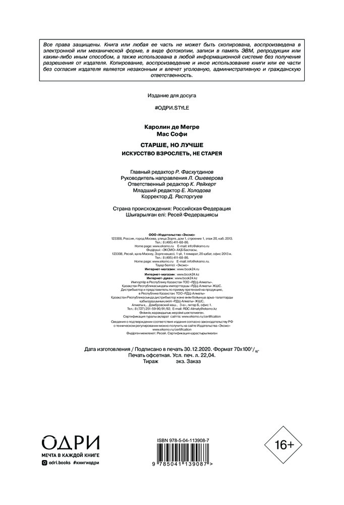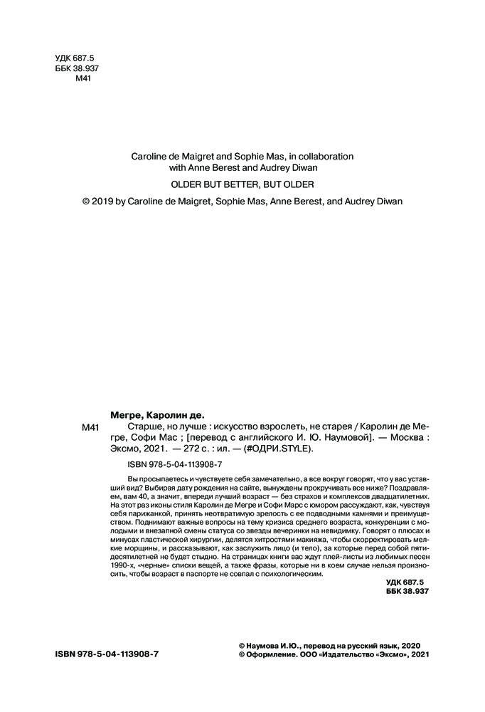 Старше, но лучше. Искусство взрослеть, не стареяВ данный момент этот товар отсутствует в продаже. Возможно, у нас найдется аналогичный или похожий товар здесь. Серия: #Одри.Style Вы просыпаетесь и чувствуете себя замечательно, а все вокруг говорят, что у вас уставший вид? Выбирая дату рождения на сайте, вынуждены прокручивать все ниже? Поздравляем, вам 40, а значит впереди лучший возраст — без страхов и комплексов двадцатилетних. На этот раз иконы стиля Каролин де Мегрэ и Софи Марс с юмором рассуждают, как, чувствуя себя парижанкой, принять неотвратимую зрелость с ее подводными камнями и преимуществом. Поднимают важные вопросы на тему кризиса среднего возраста, конкуренции с молодыми и внезапной смены статуса со звезды вечеринки на невидимку. Говорят о плюсах и минусах пластической хирургии, делятся хитростями макияжа, чтобы скорректировать мелкие морщины, и рассказывают, как заслужить лицо (и тело), за которые перед собой пятидесятилетней не будет стыдно. На страницах книги вас ждут плей-листы из любимых песен 1990-х, «черные» списки вещей, а также фразы, которые ни в коем случае нельзя произносить, чтобы возраст в паспорте не совпал с психологическим. |