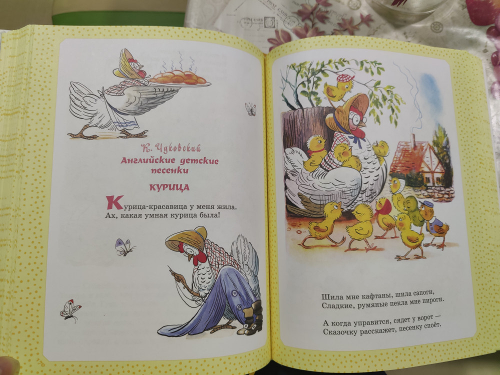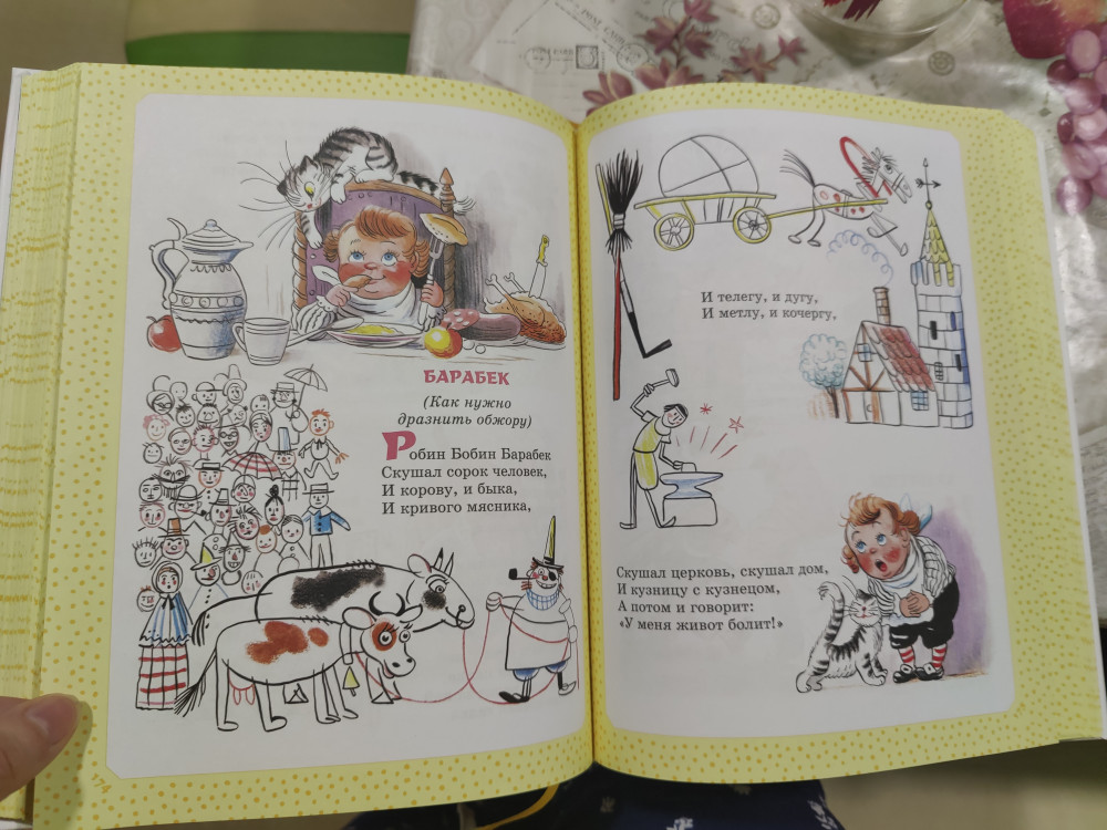 Отличное издание! Твердый переплет. Формат А4. Бумага белая. Качество печати хорошее. Есть ляссе. Замечательные иллюстрации. Подборка стихов и сказок достойная. Жаль, что не вошла сказка К.Чуковского "Айболит". Единственный недостаток - книга объемная и тяжелая. Но он перекрывается обилием сказок и стихов. Есть что почитать, есть что посмотреть. Книга рассчитана на дошкольный и младший школьный возраст. Подойдет как для чтения взрослыми детям, так и для самостоятельного чтения школьниками.