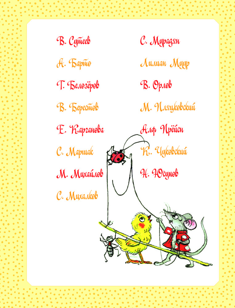 Большая книга сказок, стихов и рассказовВ данный момент этот товар отсутствует в продаже. Возможно, у нас найдется аналогичный или похожий товар здесь. Серия: Самая большая книга (подарочная) «Большая книга В. Сутеева» — это сборник сказок и стихотворений в рисунках известного художника-мультипликатора, любимца бабушек и мам, Владимира Григорьевича Сутеева. В книгу вошли произведения российских и зарубежных писателей и поэтов: А. Барто, С. Михалкова, К. Чуковского, А. Прёйсна, Л. Муур, С. Мурадяна и других. Также в сборник включены сказки самого В. Сутеева, которые входили в его наиболее известный, неоднократно переизданный сборник — «Сказки и картинки». Особенно примечательна наша книга тем, что в ней впервые после долгого перерыва публикуются иллюстрации В. Сутеева к циклу стихотворений А. Барто «Вовка — добрая душа», к стихам В. Орлова «Однажды» и «Рецепт», а также «Ёжик-портняжка» и «Уточка и дудочка» Е. Каргановой. |