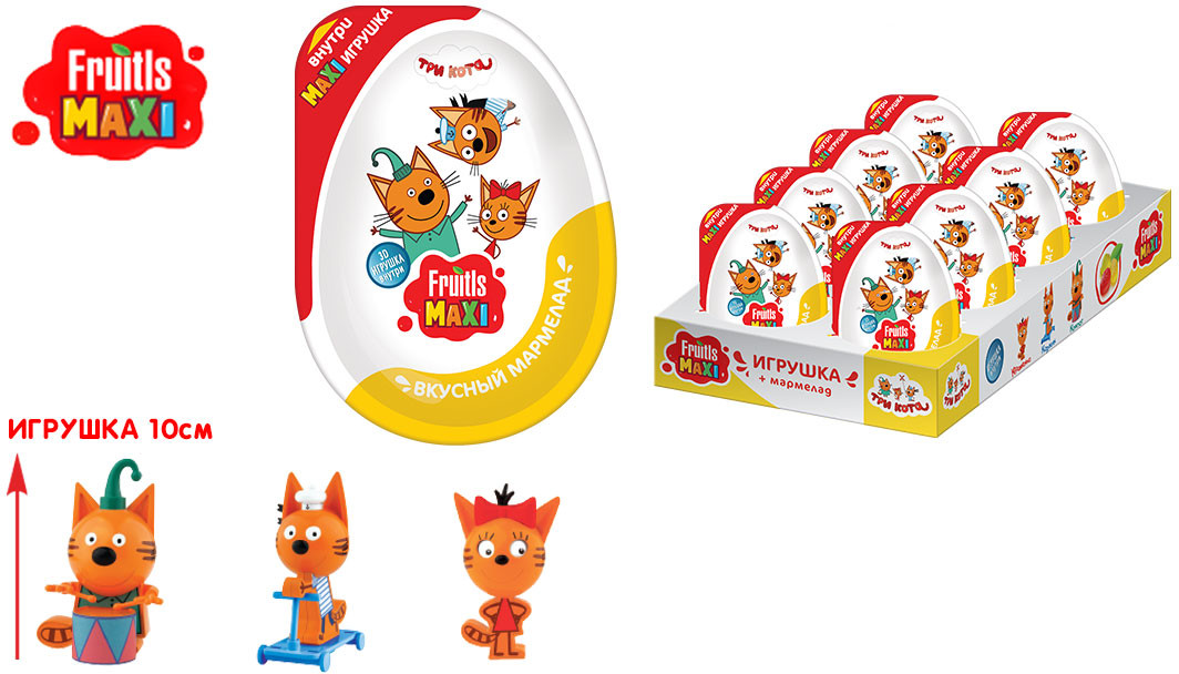 | Fruitls maxi Мармелад с игрушкой «Три кота»В данный момент этот товар отсутствует в продаже. Возможно, у нас найдется аналогичный или похожий товар здесь. Мармелад с подарком в пластиковых половинках. Внутри — единая полость, где лежит мармелад с натуральным соком, лифлет и большая игрушка, изображающая героя мультсериала «Три кота». Всего 3 коллекционных игрушки. |