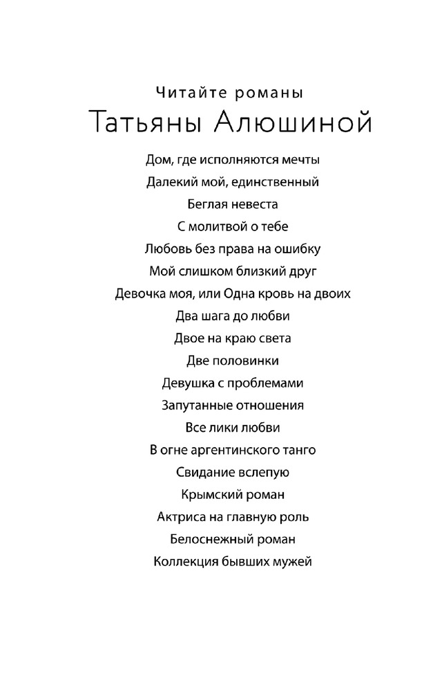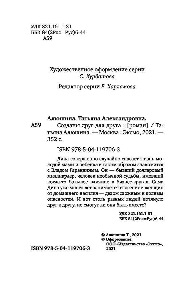 Созданы друг для другаВ данный момент этот товар отсутствует в продаже. Возможно, у нас найдется аналогичный или похожий товар здесь. Серия: Еще раз про любовь. Романы Т. Алюшиной (обложка) Дина совершенно случайно спасает жизнь молодой мамы и ребенка и таким образом знакомится с Владом Гарандиным. Он — бывший долларовый миллиардер, человек необычной судьбы, имевший когда-то большое влияние в бизнес-кругах. Сама Дина уже много лет занимается спасением женщин от домашнего насилия — делом сложным и полным опасностей. И вот столь разных людей потянуло друг к другу, но смогут ли они быть вместе? |