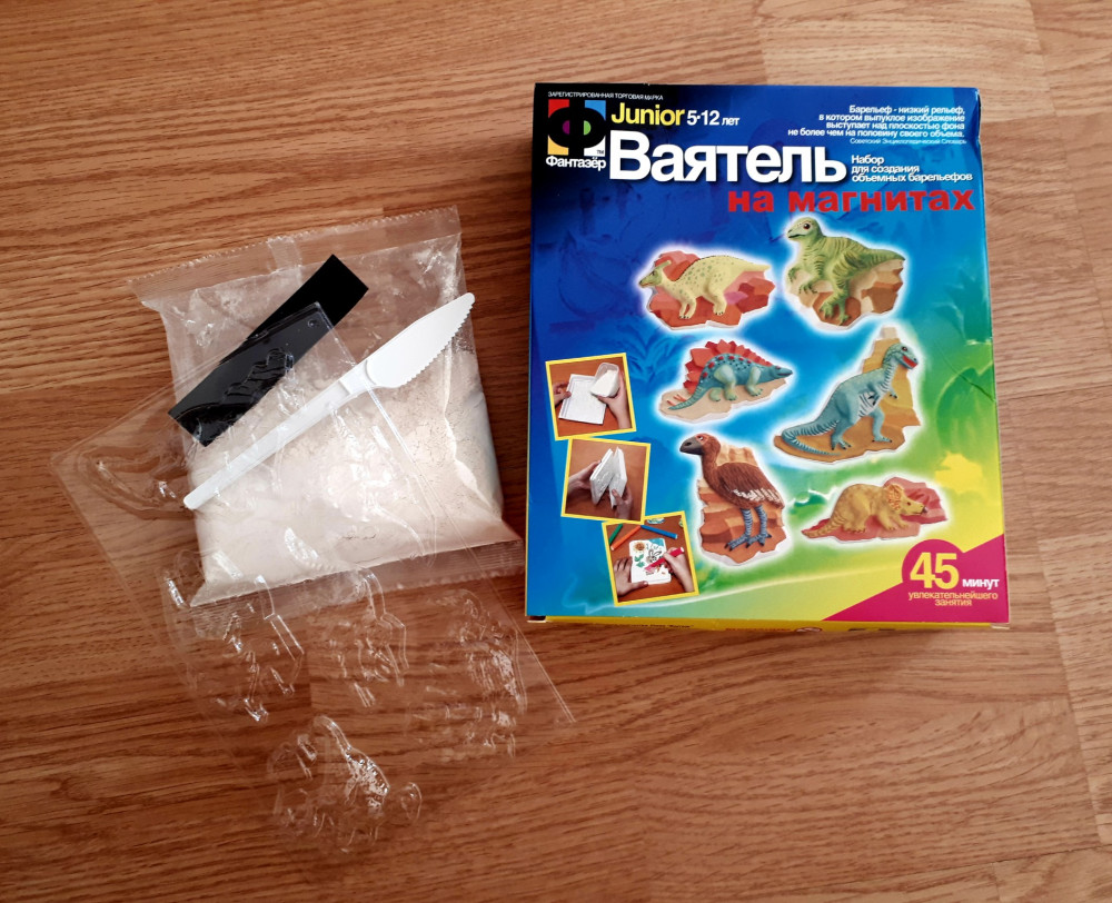 В набор входит прозрачная пластиковая форма, пакет гипса, магнитная полоска и пластиковый ножик. Прочитав отзыв, развела сначала только половину пакета гипса, чего в итоге не хватило на все барельефы. У нас ушёл практически весь гипс. После высыхания, барельефы немного крошатся и разламываются, довольно хрупкие магниты получились. Раскрасили, как было рекомендовано фломастерами. Это не очень удобно, так как магниты небольшие и рельефные, вся краска потом впиталась, на фото видно. Может лучше раскрашивать красками, надо попробовать. Магнитной ленты мало, и она не очень хорошо прилипает к барельефу, у нас падают магниты с холодильника и разламываются. В целом можно разок другой позаниматься для разнообразия