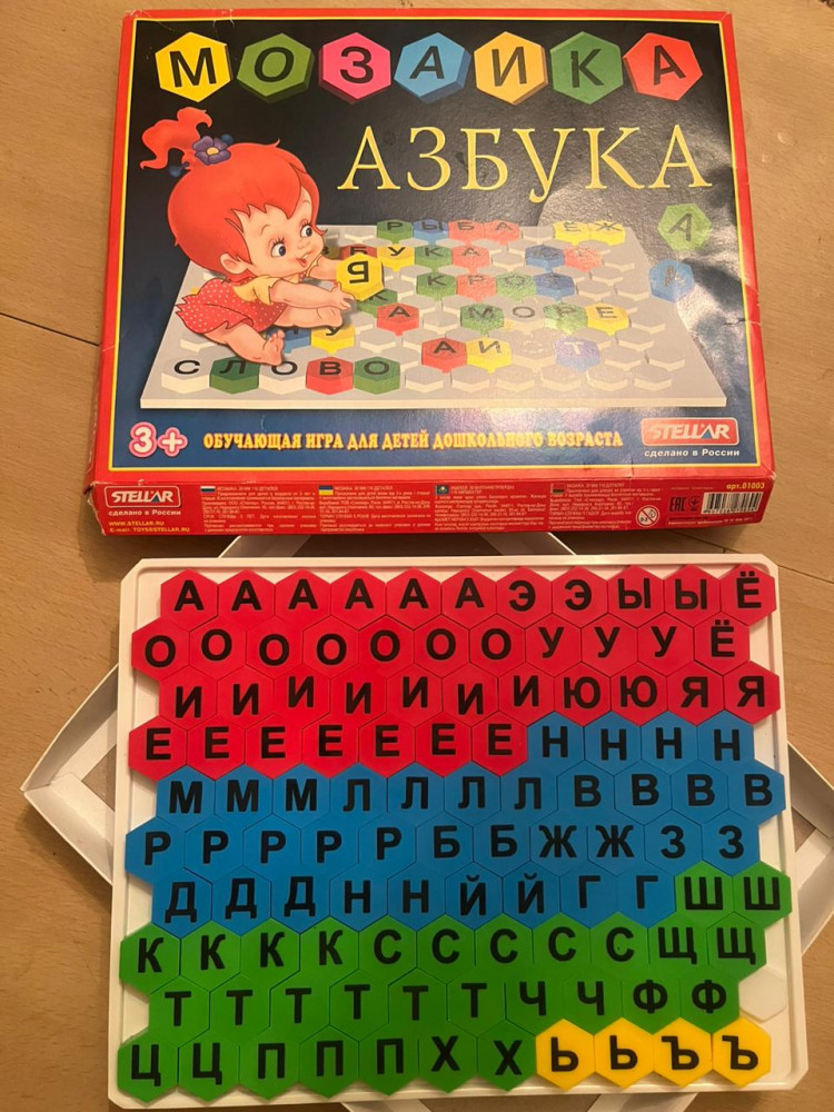 В комплект входит доска пластмассовая, на которой зафиксированы буквы, в количестве 110 штук. Буквы в форме шестиугольников, оригинально, но не практично. Черные буквы на разноцветных шестиугольниках. Красный шестиугольник – гласные, синие и зеленные – согласные (звонкие, глухие), благодаря чему можно изучить некоторые темы из школьной программы. Желтые – мягкий знак и твердый знак. На упаковке есть информация - запрещается детям до 3 лет. По-моему мнению в мозаику играть можно с детьми и раньше года под тщательным взрослым присмотром.