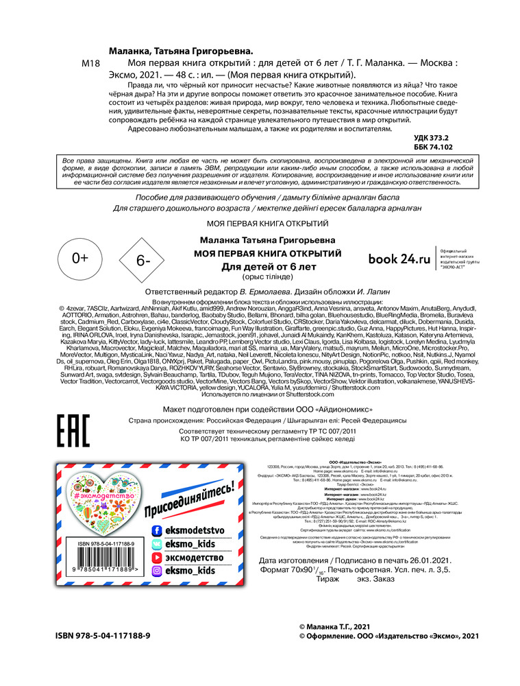 💳 Оплатить за товар можно при получении 🇰🇿 Есть бесплатная доставка по Казахстану 🎁 Копите бонусы с каждой покупки Серия: Моя первая книга открытий Правда ли, что чёрный кот приносит несчастье? Какие животные появляются из яйца? Что такое чёрная дыра? На эти и другие вопросы поможет ответить это красочное занимательное пособие. Книга состоит из четырёх разделов: живая природа, мир вокруг, тело человек и техника. Любопытные сведения, удивительные факты, невероятные секреты, познавательные тексты, красочные иллюстрации будут сопровождать ребёнка на каждой странице увлекательного путешествия в мир открытий. |