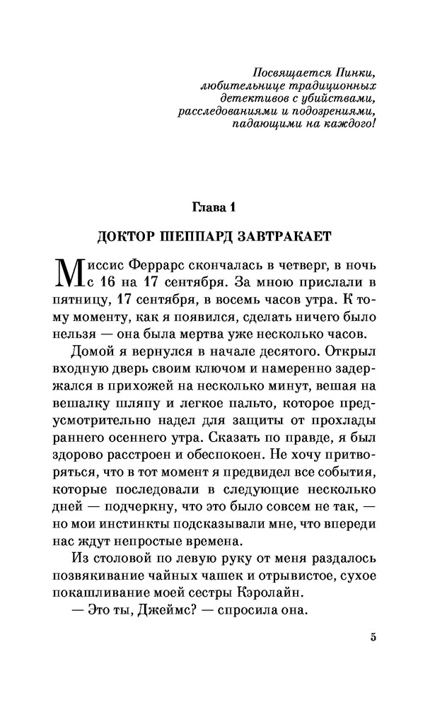 Серия: Pocket Book (обложка) Поначалу убийство эсквайра Роджера Экройда не казалось полиции загадочным — все указывало на виновность пасынка убитого. Но иначе считает Эркюль Пуаро, который недавно переехал в эти места, в очередной раз решив уйти на покой. Его попросила помочь племянница Экройда, которая не верит в виновность молодого человека. И Эркюль Пуаро начинает расследование, имея вокруг множество подозреваемых — родственников и знакомых эсквайра, каждый из которых был заинтересован в его смерти. Повествование ведется от имени доктора Шеппарда, последнего, кто видел Экройда живым. С помощью его записей Пуаро предстоит вычислить хитроумного преступника... |