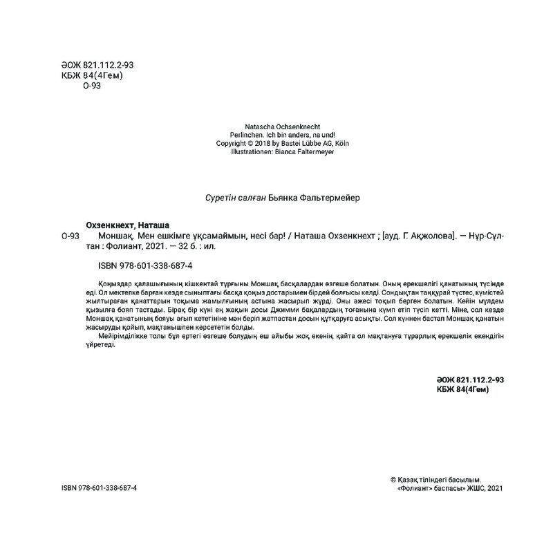 Моншақ. Мен ешкімге ұқсамаймын, несі бар!В данный момент этот товар отсутствует в продаже. Возможно, у нас найдется аналогичный или похожий товар здесь. Қоңыздар қалашығының кішкентай тұрғыны Моншақ басқалардан өзгеше болатын. Оның ерекшелігі қанатының түсінде еді. Ол мектепке барған кезде сыныптағы басқа қоңыз достарымен бірдей болғысы келді. Сондықтан таңқурай түстес, күмістей жылтыраған қанаттарын тоқыма жамылғының астына жасырып жүрді. Оны әжесі тоқып берген болатын. Кейін мүлдем қызылға бояп тастады. Бірақ бір күні ең жақын досы Джимми бақалардың тоғанына күмп етіп түсіп кетті. Міне, сол кезде Моншақ қанатының бояуы ағып кететініне мән беріп жатпастан досын құтқаруға асықты. Сол күннен бастап Моншақ қанатын жасыруды қойып, мақтанышпен көрсететін болды. |