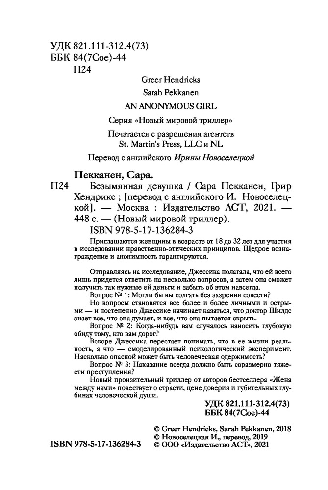 Серия: Новый мировой триллер (м) Приглашаются женщины в возрасте от 18 до 32 лет для участия в исследовании нравственно-этических принципов. Щедрое вознаграждение и анонимность гарантируются. |