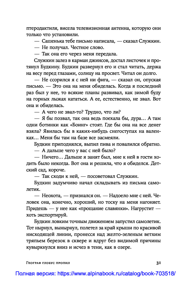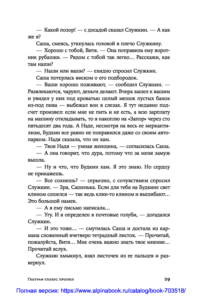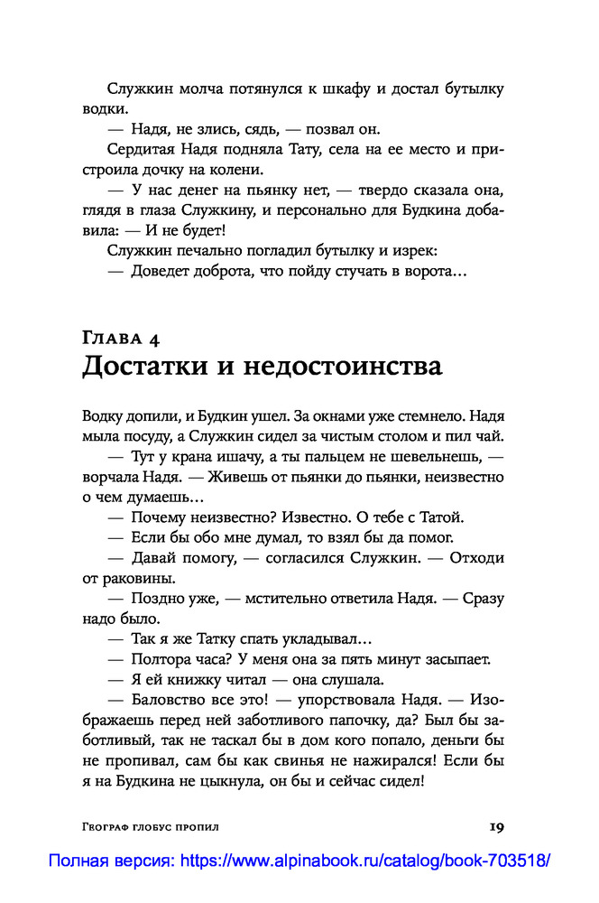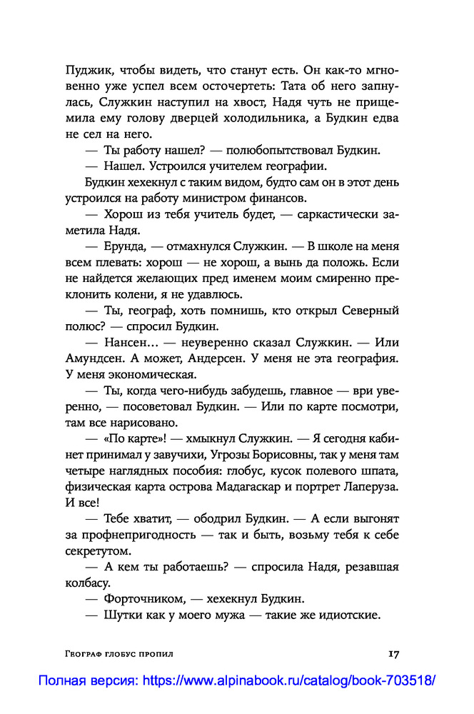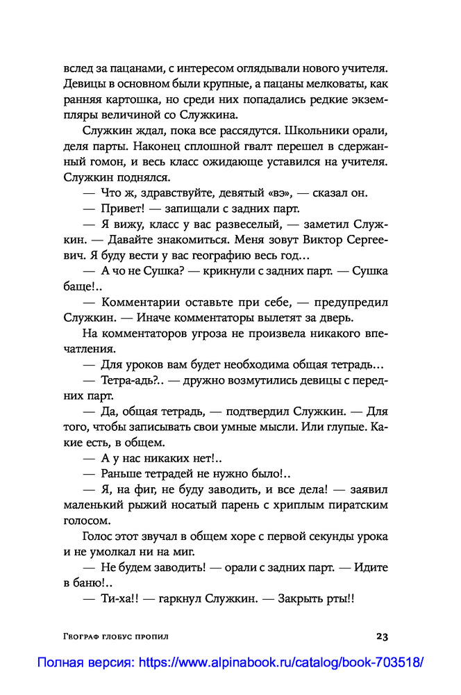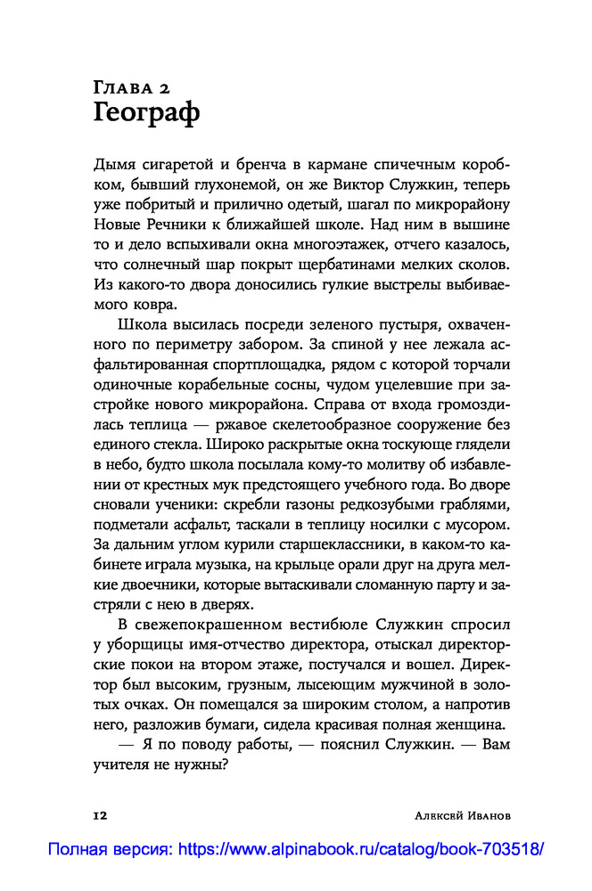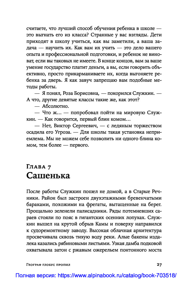 Это роман вовсе не о том, что весёлый парень Витька не может в своей жизни обрести опору. И не о том, что молодой учитель географии Служкин влюбляется в собственную ученицу. Это роман о стойкости человека в ситуации, когда нравственные ценности не востребованы обществом. |