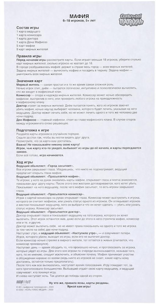 Серия: Сказочный патруль Командная игра «Сказочный патруль. Мафия» ТМ «Умные игры» — знаменитая игра с героями любимого мультфильма. С помощью данного набора можно поиграть в классическую «Мафию» в новом оформлении — в стиле известного мультсериала: в городе Мышкине неспокойно, Карабас Барабас со своими приспешниками хочет заколдовать волшебниц из «Сказочного патруля» и всех мирных жителей. |