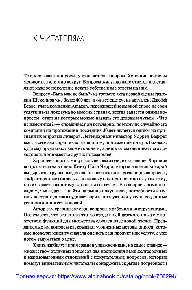 Специалисты по продажам, безусловно, досконально знают особенности своего продукта, но зачастую этого бывает недостаточно для того, чтобы заключить сделку. Автор книги Пол Черри раскрывает свой главный секрет успеха в области продаж: проявлять искренний интерес к клиентам и задавать им правильные вопросы — те, которые продают. |