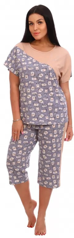 Размер не соответствует - явно маломерит. Очень толстая резинка на брюках - это не для сна. И стразы на футболке - довольно острые углы, можно поцарапаться во сне...из швов торчат нитки. Возврат.