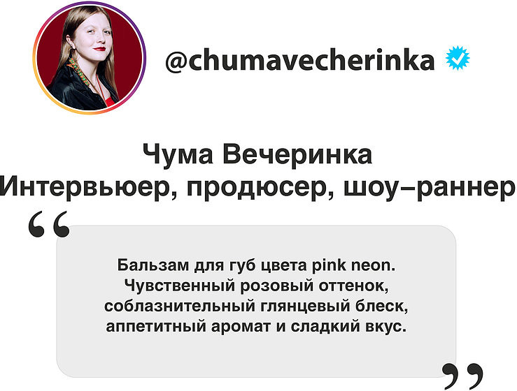 У бальзама очень красивый прозрачный розовый оттенок и приятный аромат. Но бальзам не увлажняет, не питает, и вообще не сильно стойкий. Не могу никому его порекомендовать, не смотря на всю мою любовь к @chumavecherinka.
