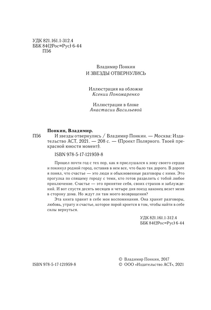 Серия: Проект Полярного. Твоей прекрасной юности момент Прошел почти год с тех пор, как я прислушался к зову своего сердца и покинул родной город, оставив в нем все, что было так дорого. В дороге я понял, что счастье — это люди и обыкновенные разговоры с ними. Это прогулка по спящему городу с теми, кто готов разделить с тобой любое приключение. Счастье — это принятие себя, своих страхов и заблуждений. И вот спустя десять месяцев и четыре дня поезд наконец везет меня в сторону дома. Но ждут ли там моего возвращения? Эта книга хранит в себе мои воспоминания. Она хранит разговоры, любовь, утрату и счастье, которое порой кроется в том, чтобы найти в себе силы вернуться. |
