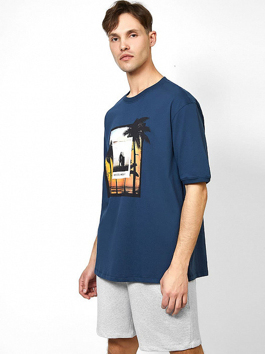 Футболка из кулирного полотна. Силуэт прямой, свободный. Длина до середины бедер. Спинка и перед без швов и рельефов. Горловина круглая. Линия плеча спущена. Рукава короткие с манжетами из рибаны. Интересный дизайн!