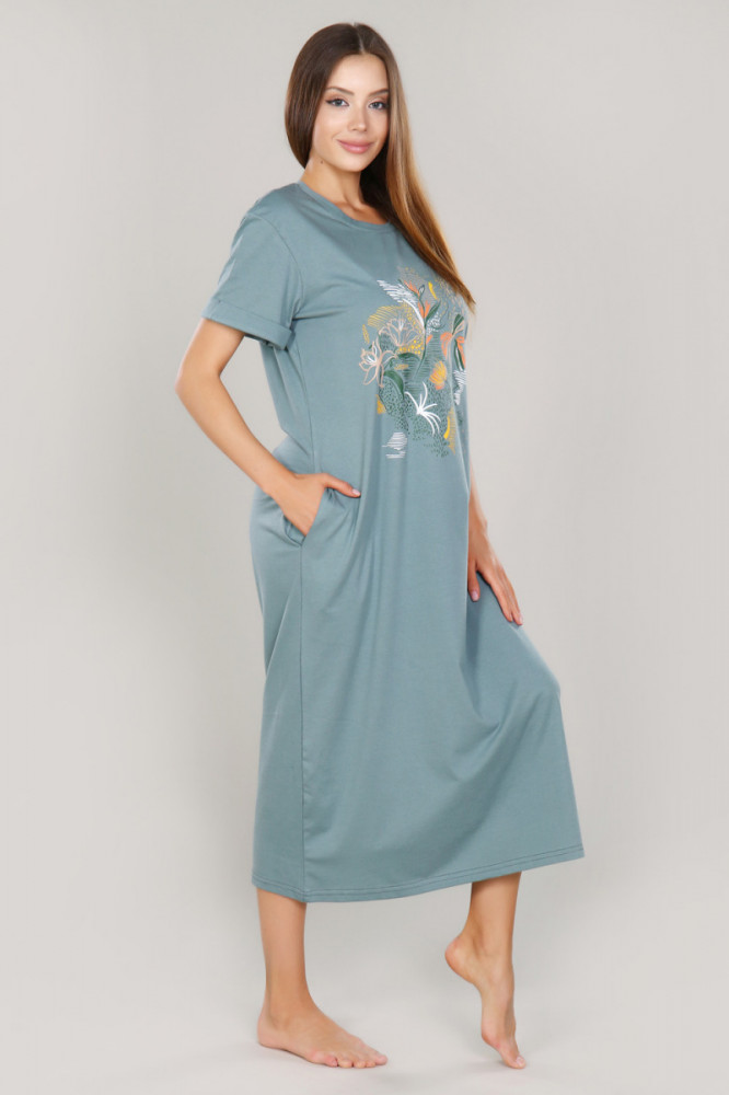 Платье идёт размер в размер. Цвет хаки с уклоном в зелень, не как на картинке, что простит модель. Для дома пойдет в качестве домашней одежды.