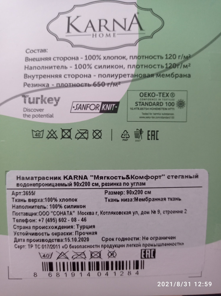 Имея наматрасник подобного типа (с резинками для углов) другого производителя (на другой матрас), т.е. понимая, что это такое, как он надевается и как он должен лежать на матрасе, не смогли его надеть. И даже не могу объяснить, почему - может, не хватает высоты матраса (заявлена 30 см, у нас 20 см) или причина в чём-то другом. Начинаешь цеплять резинками за углы с одной стороны - наматрасник не ложится ровно по поверхности, а сползает и облегает боковину матраса. Вертели-крутили - ничего не помогло, результат один и тот же. К сожалению, возврат.
