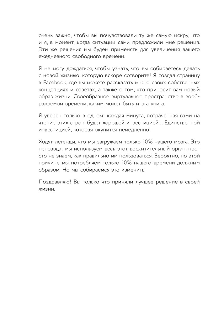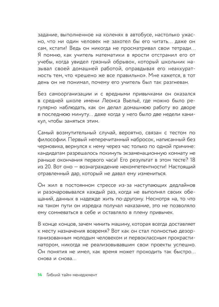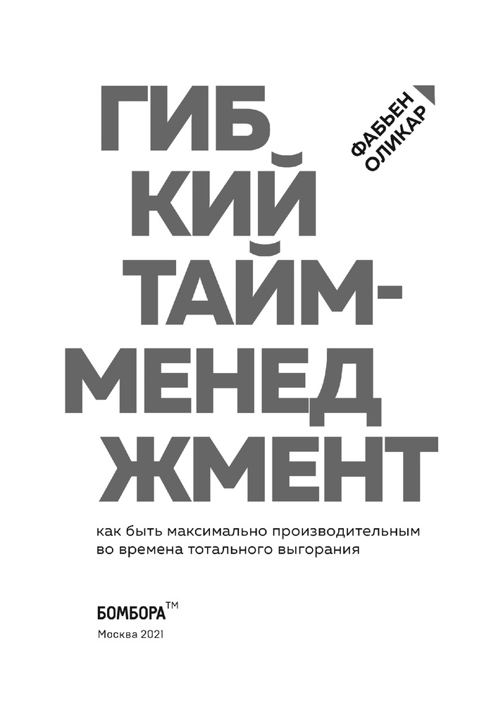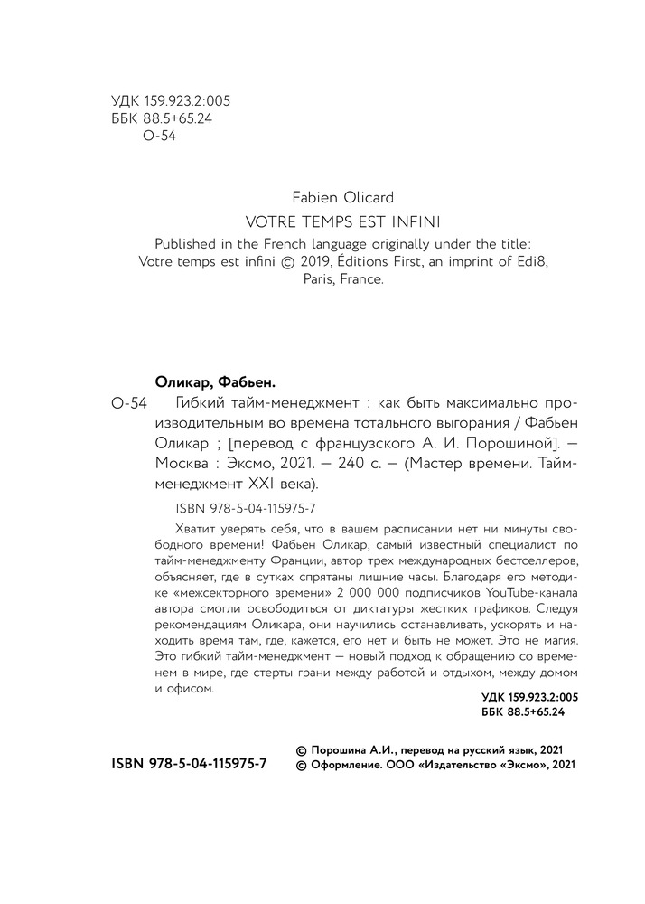 Гибкий тайм-менеджмент. Как быть максимально производительным во времена тотального выгоранияВ данный момент этот товар отсутствует в продаже. Возможно, у нас найдется аналогичный или похожий товар здесь. Серия: Книги-драйверы Хватит уверять себя, что в вашем расписании нет ни минуты свободного времени! Фабьен Оликар, самый известный специалист по тайм-менеджменту Франции, автор 3 международных бестселлеров, объясняет, где в сутках спрятаны лишние часы. Благодаря его методике «межсекторного времени» 2 000 000 подписчиков YouTube-канала автора смогли освободиться от диктатуры жестких графиков. Следуя рекомендациям Оликара, они научились останавливать, ускорять и находить время там, где, кажется, его нет и быть не может. Это не магия. Это гибкий тайм-менеджмент — новый подход к обращению со временем в мире, где стерты грани между работой и отдыхом, между домом и офисом. |