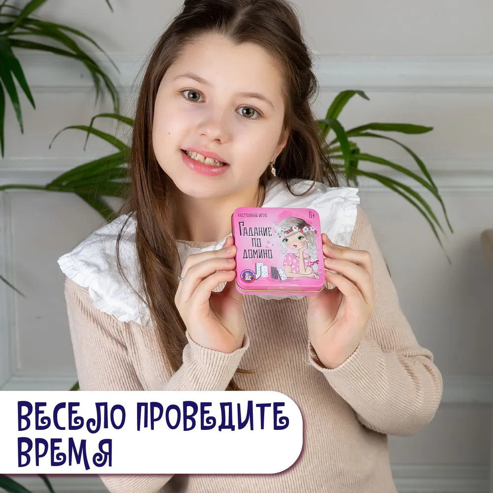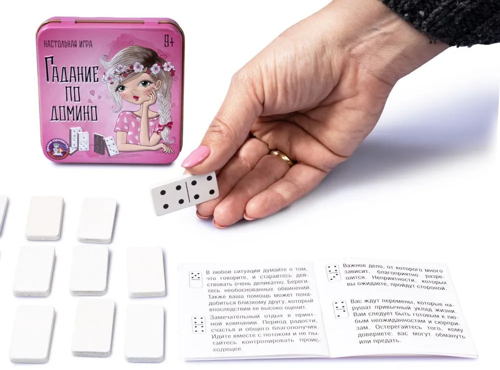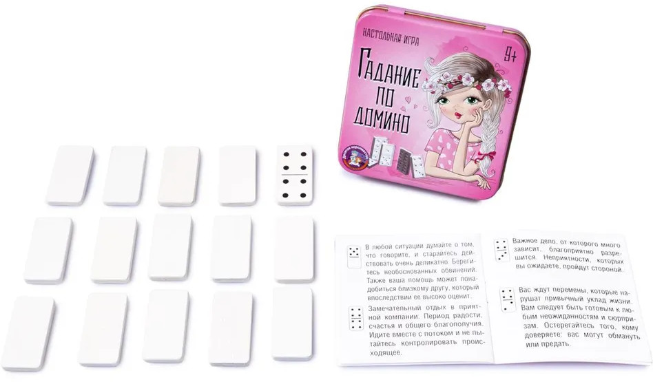 Не знала, что можно гадать по домино, дочь заинтересовалась и попросила эту игру. Костяшки ровные, плотные, упакованы в жестяную коробочку, которая заклеена производителем в плёнку. Единственное - в карточке товара написано, что материал пластик, но на самом деле костяшки деревянные. Упаковка очень красивая, спасибо за быструю доставку.