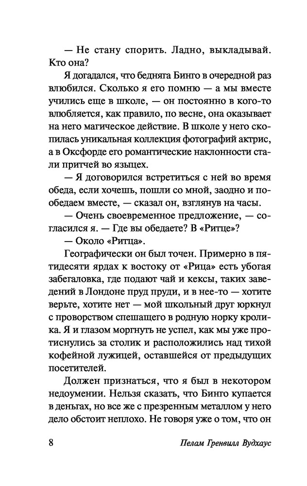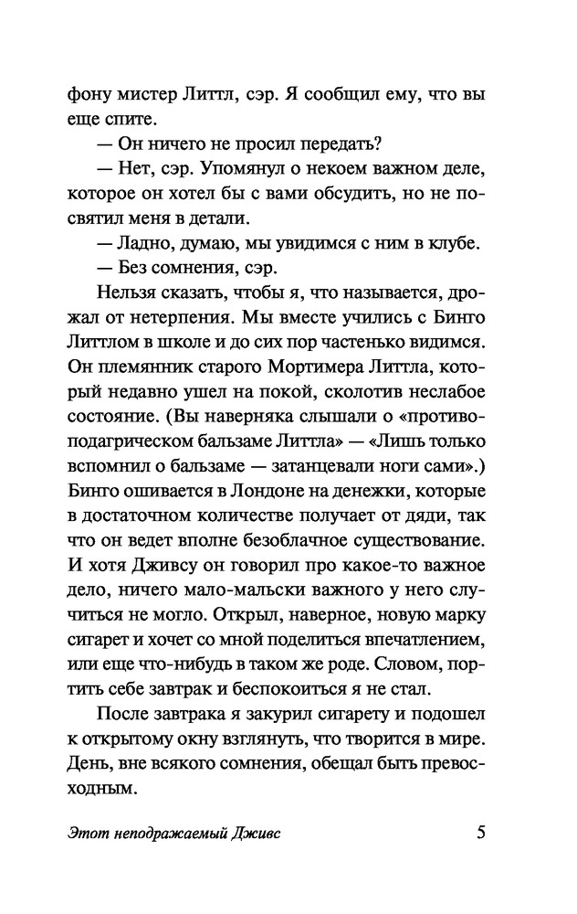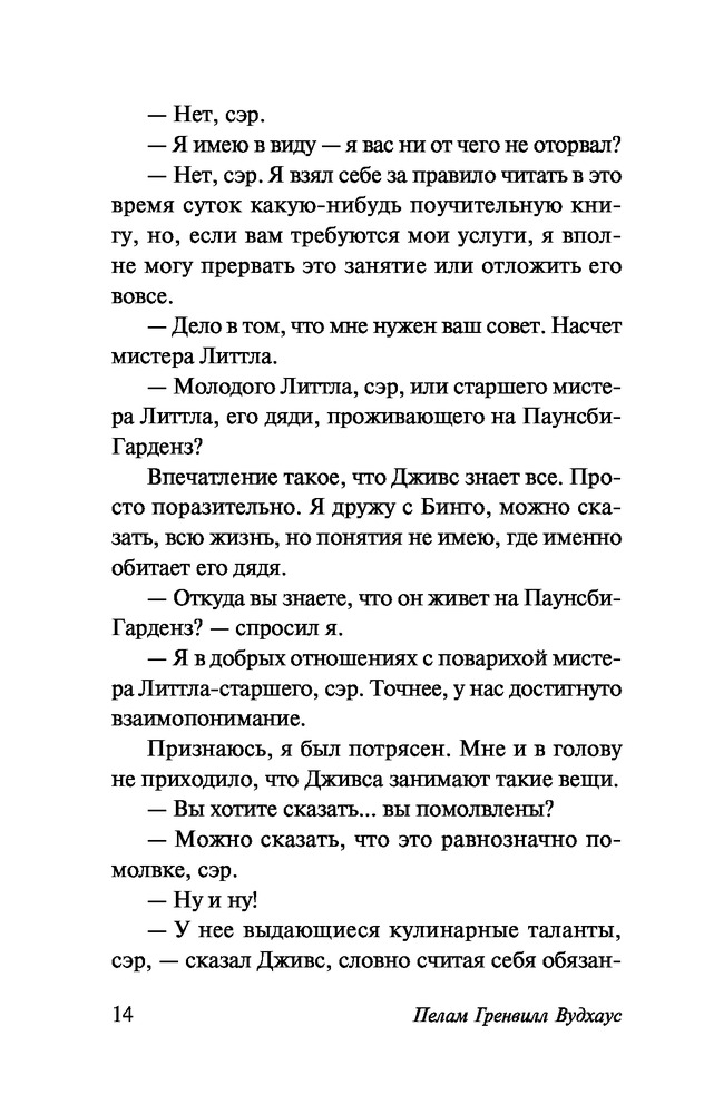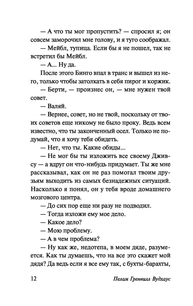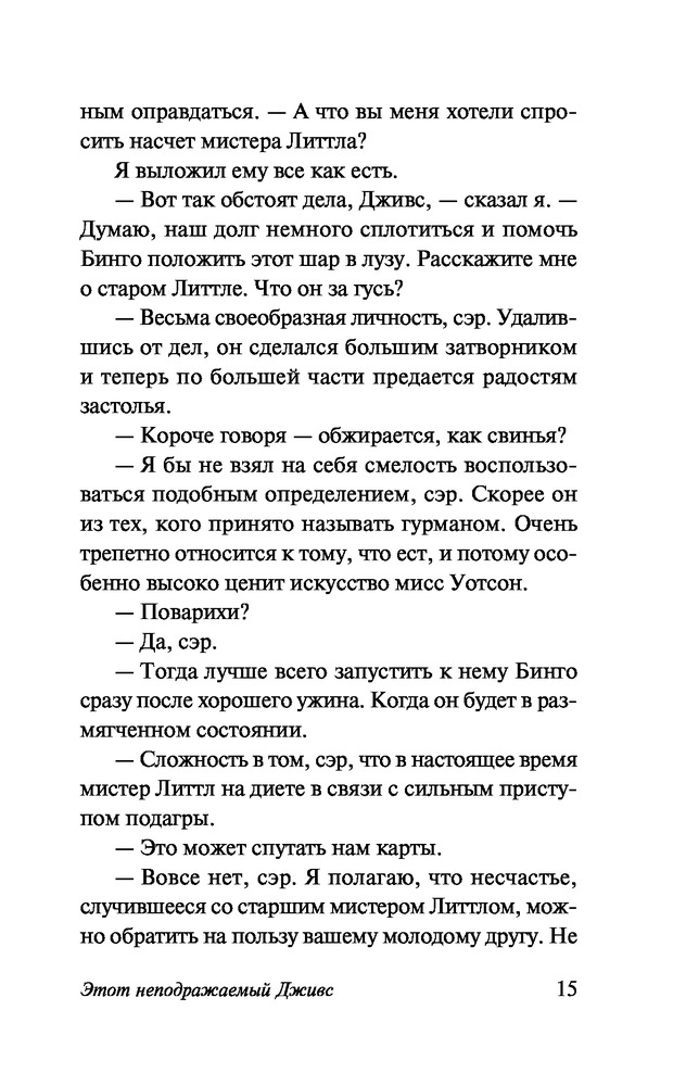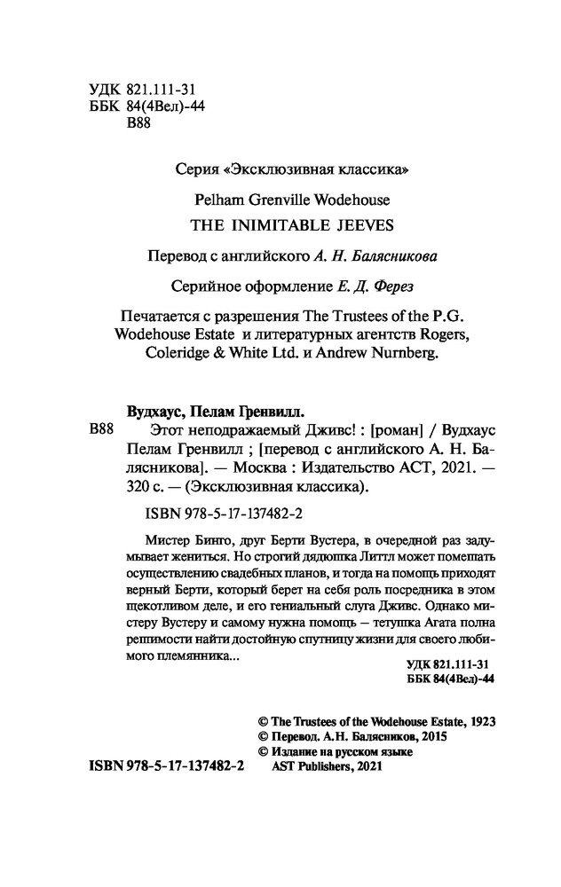Серия: Эксклюзивная классика (Лучшее) Мистер Бинго, друг Берти Вустера, в очередной раз задумывает жениться. Но строгий дядюшка Литтл может помешать осуществлению свадебных планов, и тогда на помощь приходят верный Берти, который берет на себя роль посредника в этом щекотливом деле, и его гениальный слуга Дживс. Однако мистеру Вустеру и самому нужна помощь — тетушка Агата полна решимости найти достойную спутницу жизни для своего любимого племянника... |