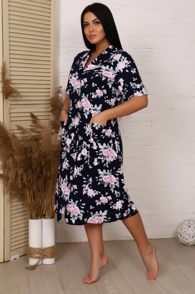 Ткань хб,г.Иваново,пошив отличный.Очень понравился,хотела именно с английским воротником и на пуговицах, т.к.молнии часто ломаются.Хорошая расцветка.На мой взгляд,это идеальный халат, классического фасона.