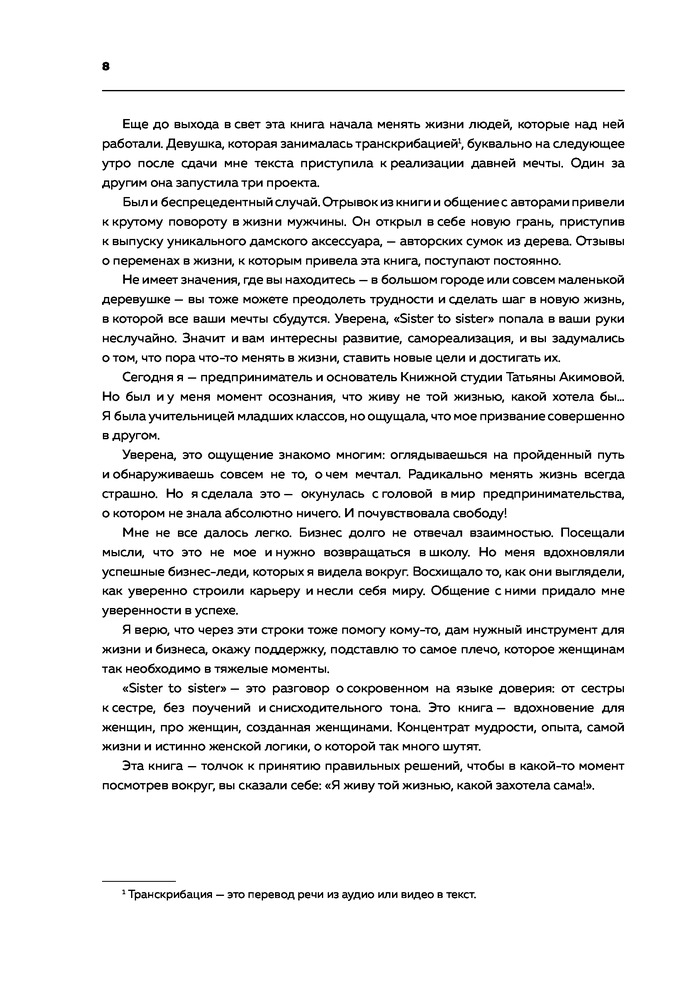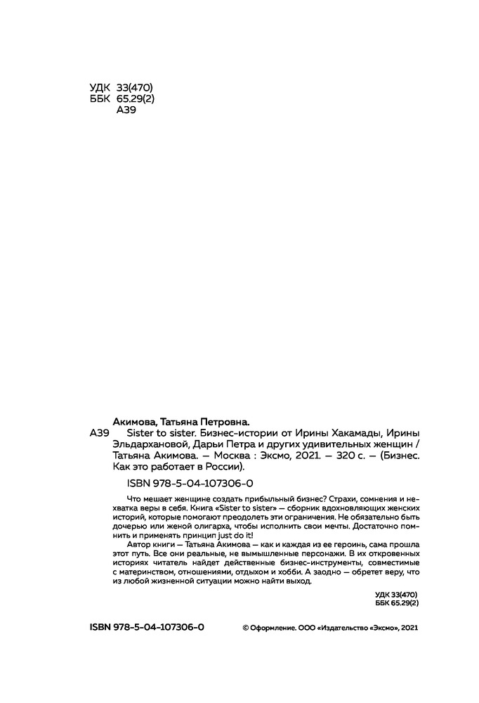 💳 Оплатить за товар можно при получении 🇰🇿 Есть бесплатная доставка по Казахстану 🎁 Копите бонусы с каждой покупки Серия: Бизнес. Как это работает в России Что мешает женщине создать прибыльный бизнес? Страхи, сомнения и нехватка веры в себя. Книга «Sister to sister» — сборник вдохновляющих женских историй, которые помогают преодолеть эти ограничения. Не обязательно быть дочерью или женой олигарха, чтобы исполнить свои мечты. Достаточно помнить и применять принцип just do it! |