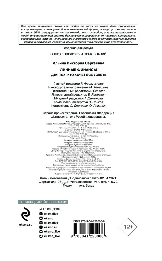 💳 Оплатить за товар можно при получении 🇰🇿 Есть бесплатная доставка по Казахстану 🎁 Копите бонусы с каждой покупки Серия: Энциклопедия быстрых знаний (обложка) Мы с вами живем в очень прагматичное время, но — интересный парадокс! — большинство из нас при этом не умеют обращаться с деньгами. Эта книга, наполненная конкретными примерами и простыми в использовании инструментами, представляет тему личных финансов как реальные решения, которые позволят освободиться от ограничений и встать на ноги в финансовом отношении. Вы узнаете, как работают сбережения, что такое инвестиции и какими они бывают, научитесь управлять своим бюджетом, измените способы потребления и будете уверенно подходить ко многим решениям, связанным с деньгами. |