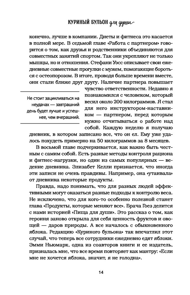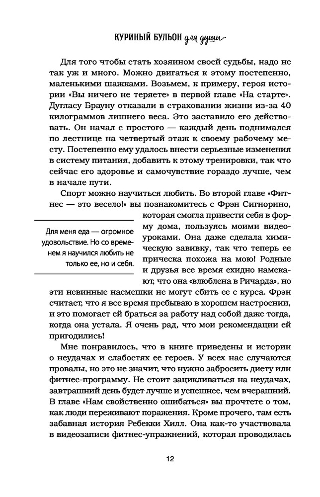 Серия: Куриный бульон для души. Юбилейное издание (обложка) Хотите похудеть, начать правильно питаться, завести здоровые привычки, прийти в форму? Нет лучшей мотивации, чем услышать чужую историю. «Куриный бульон для души. Создай себя заново» ̶ лучшая книга для тех, кто начинает здоровый образ жизни. Позитивные, практичные и целеустремленные рассказы о фитнесе и работе над собой подскажут, как полюбить себя и вдохновят сделать шаг навстречу здоровому, подтянутому и красивому телу.