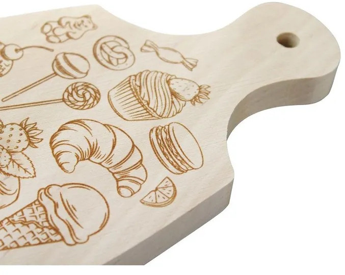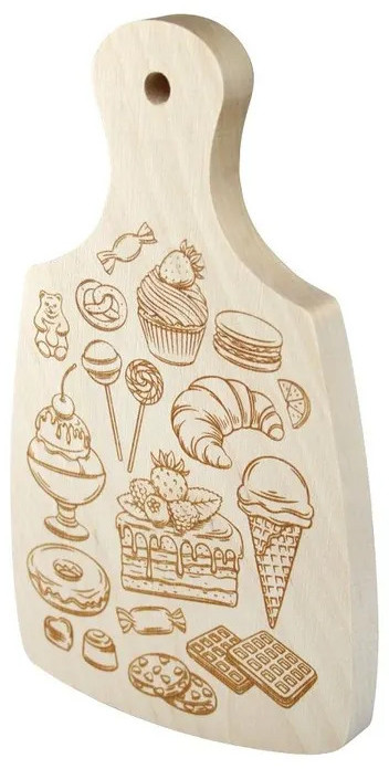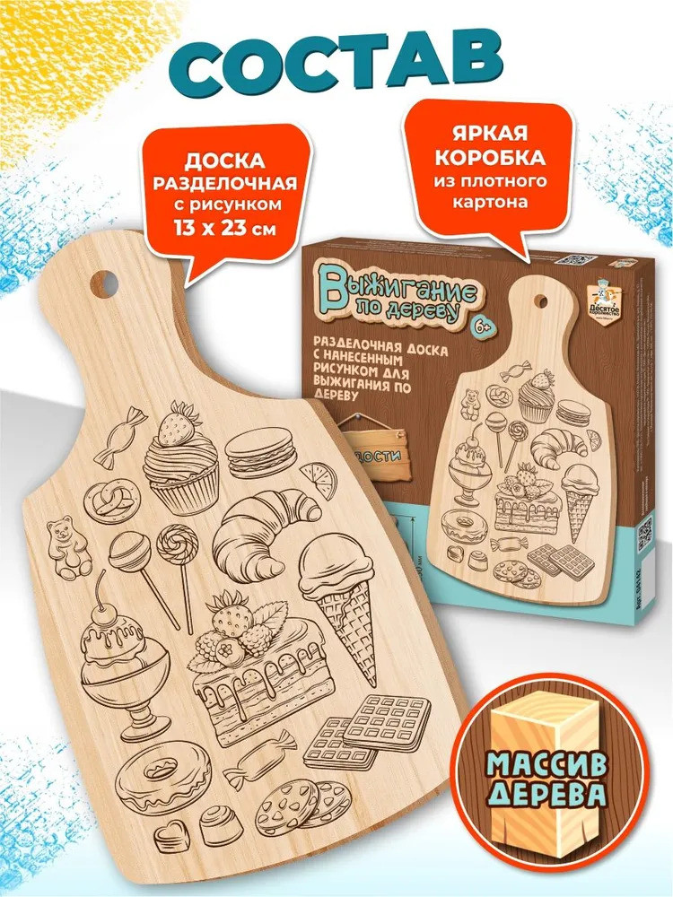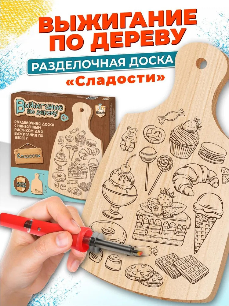 Серия: Выжигание по дереву Создай симпатичную картинку на разделочной доске из массива дерева. Навыки рисования не нужны, потому что на полотно уже нанесён простой линейный рисунок, который будет легко повторить. Доска изготовлена из массива дерева, рисунок нанесён специальной краской, не выделяющей в процессе выжигания вредные вещества. С помощью выжигателя нанесите рисунок по линиям и у вас получится вкусная композиция из конфет. |