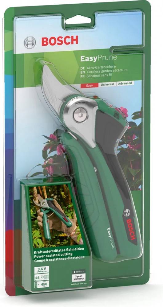 Аккумуляторный секатор «Bosch EasyPrune» служит для обрезания кустов и толстых веток. Работает от литий-ионного аккумулятора, который характеризуется отсутствием эффекта памяти и саморазряда. Чистый срез. Инструмент обеспечивает безвредную для растений подрезку благодаря чистому срезу. В зависимости от выполняемой работы можно выставить три уровня усиления: низкий, средний и высокий. Наличие индикатора состояния батареи позволяет визуально определить уровень заряда аккумулятора.