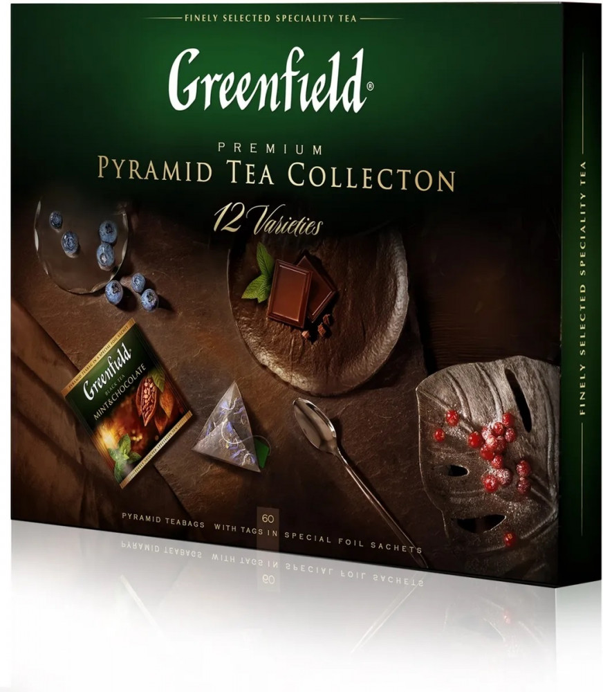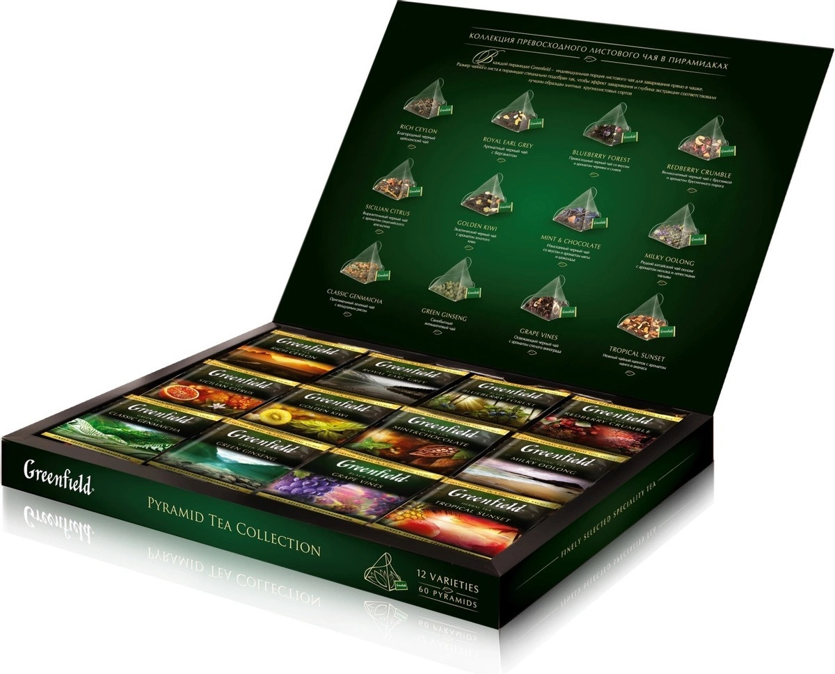 12 видов чая, по 5 пачек каждого вида. Подарила маме. Ей понравился и сам чай, и красивая упаковка.