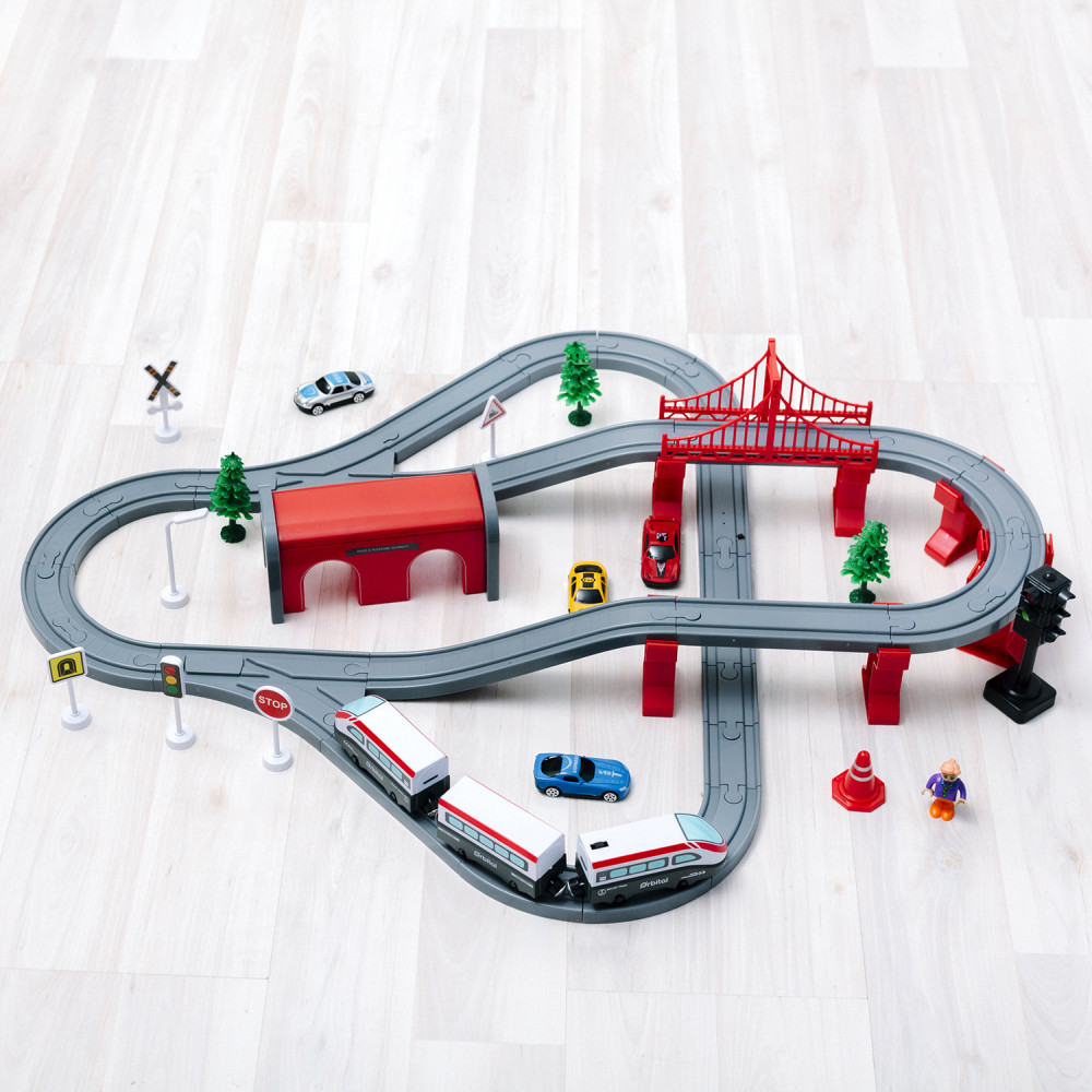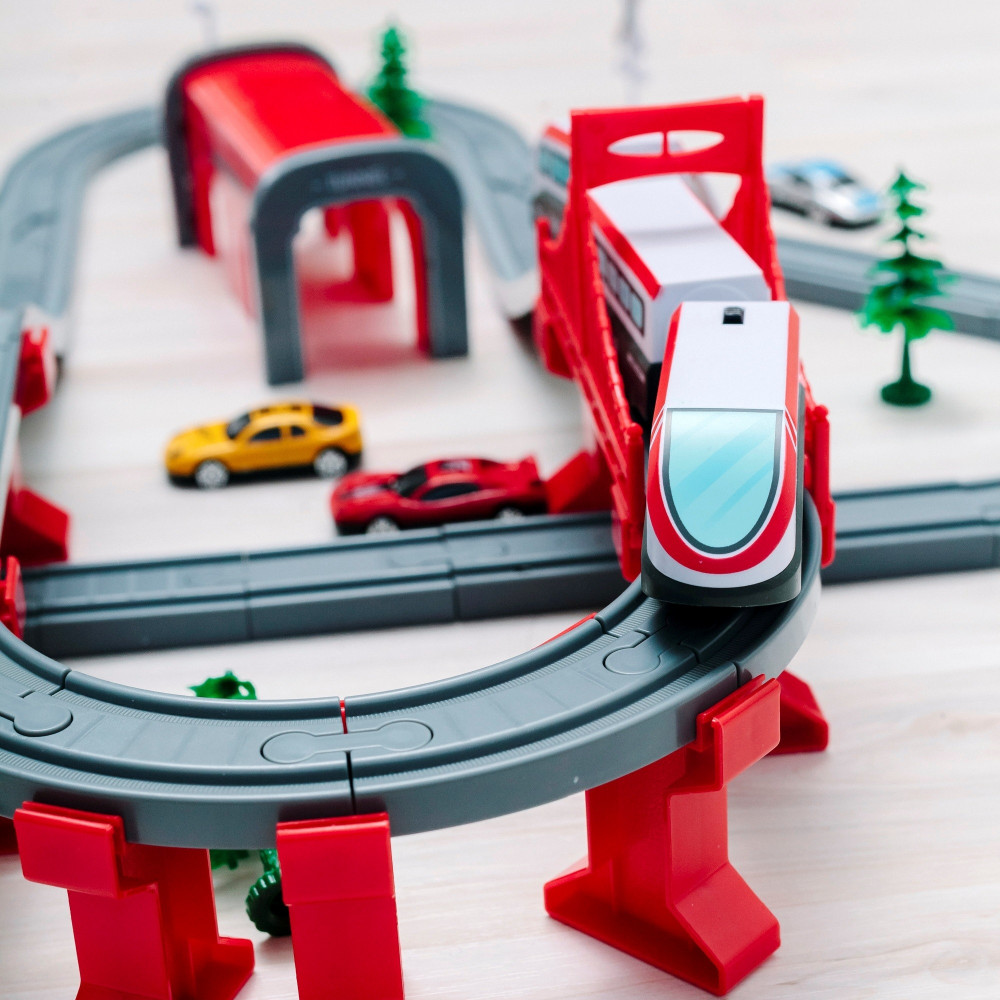 Комплектация: локомотив, два вагона, железная дорога, мост, туннель, три машинки, дорожные знаки (6 штук), деревья (2 штуки), фигурка жителя.