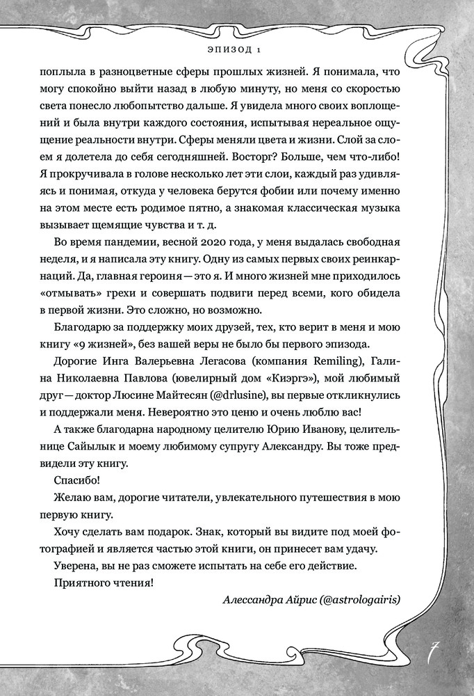Эта история началась, когда астролог Александра Айрис узнала, кем она была в прошлых жизнях. Итогом стала книга, в которой автор описал одну из первых своих реинкарнаций...«Да, главная героиня — это я, — говорит Алессандра. — И много жизней подряд мне приходилось «отмывать» грехи и совершать подвиги перед всеми, кого я обидела в своем первом воплощении. Это сложно, но возможно».