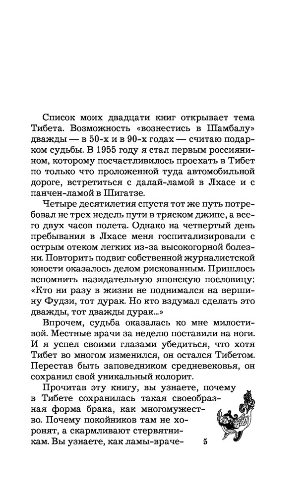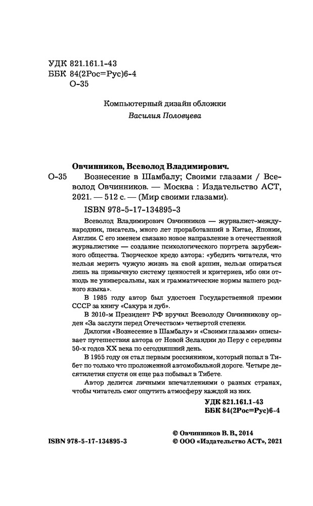 Вознесение в Шамбалу. Своими глазамиВсеволод Владимирович Овчинников В данный момент этот товар отсутствует в продаже. Возможно, у нас найдется аналогичный или похожий товар здесь. Серия: Мир своими глазами Всеволод Владимирович Овчинников — журналист-международник, писатель, много лет проработавший в Китае, Японии, Англии. С его именем связано новое направление в отечественной журналистике — создание психологического портрета зарубежного общества. Творческое кредо автора: «убедить читателя, что нельзя мерить чужую жизнь на свой аршин, нельзя опираться на привычную систему ценностей и критериев, ибо они отнюдь не универсальны, как и грамматические нормы нашего родного языка». Автор, первый из россиян, побывавший в Тибете; в 50-х и 90-х годах он провел в загадочной Шамбале сто дней. В 1955 году он беседовал с далай-ламой, когда тот еще был верховным правителем горного края; посетил школу астрологии и медицины, где ламы совершенствуются в искусстве ясновидения и прорицания. |