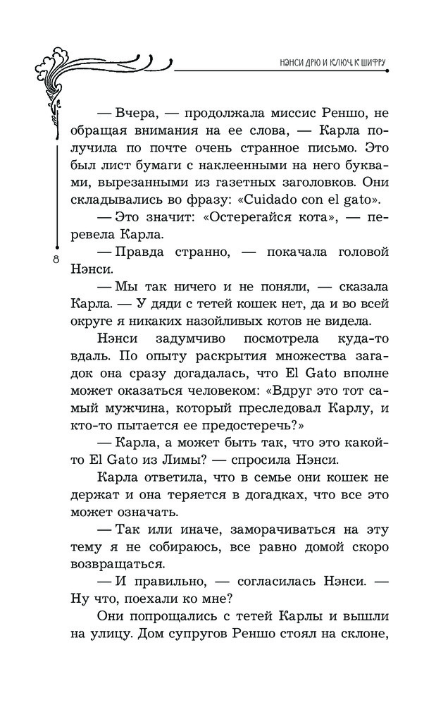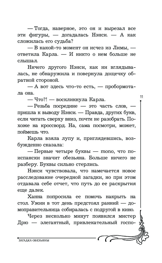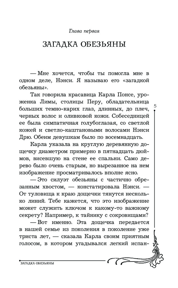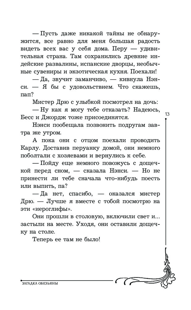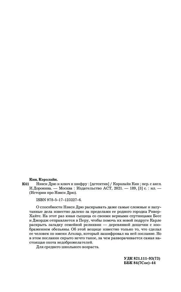 Нэнси Дрю и ключ к шифруВ данный момент этот товар отсутствует в продаже. Возможно, у нас найдется аналогичный или похожий товар здесь. Серия: Истории про Нэнси Дрю О способности Нэнси Дрю раскрывать даже самые сложные и запутанные дела известно далеко за пределами ее родного городка Ривер-Хайтс. На этот раз юная сыщица со своими верными спутницами Бесс и Джордж отправляется в Перу, чтобы помочь их новой подруге Карле раскрыть загадку семейной реликвии — деревянной дощечки с изображением обезьяны. Об этой вещице известно только то, что сделал ее человек по имени Агилар, который зашифровал на ней послание. Но в этом послании скрыто нечто такое, за чем разворачивается самая настоящая охота недоброжелателей. |
