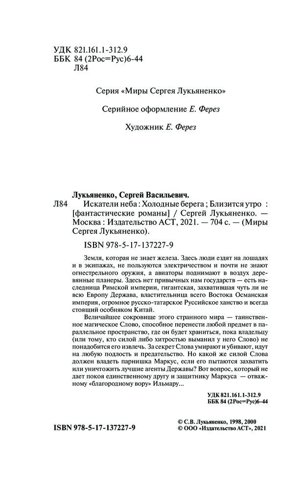 Серия: Миры Сергея Лукьяненко Земля, которая не знает железа. Здесь люди ездят на лошадях и в экипажах, не пользуются электричеством и почти не знают огнестрельного оружия, а авиаторы поднимают в воздух деревянные планеры. Здесь нет привычных нам государств, мир поделили между собой гигантская, захватившая Европу Держава — наследница Римской империи, покорившая Восток Османская империя, гигантское русско-татарское Руссийское ханство и всегда стоящий особняком Китай.