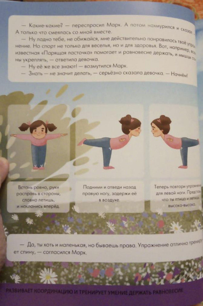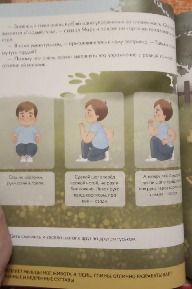 Книга понравилась. Ребенок 2 года 9 месяцев честно пытается повторить упражнения, подражая животным. Красочные рисунки стимулируют желание делать зарядку. Доходчиво расписано и нарисовано каждое движение. Есть сноска на какие группы мышц упражнение действует. Сам текст - диалог сестры и брата - дочке не интересен (может в силу возраста) и, на мой взгляд, довольно скучный. Но в остальном - супер.