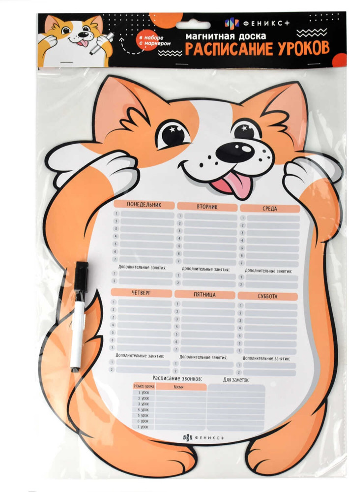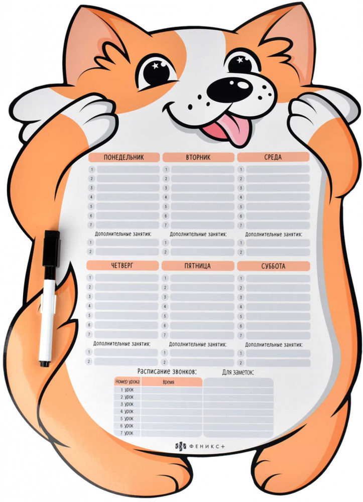 Феникс + Расписание магнитное «Корги»В данный момент этот товар отсутствует в продаже. Возможно, у нас найдется аналогичный или похожий товар здесь. Расписание уроков поможет юному ученику привыкнуть к учебным будням, а школьнику в более старших классах, расписание поможет грамотно распределить выполнение уроков. Расписание рассчитано на 6-ти дневную учебную неделю. Яркий дизайн понравится детям. Магнитное основание доски позволяет закрепить ее на холодильнике или других металлических поверхностях. В комплекте идет маркер, которым можно сделать все необходимые пометки в расписании. |
