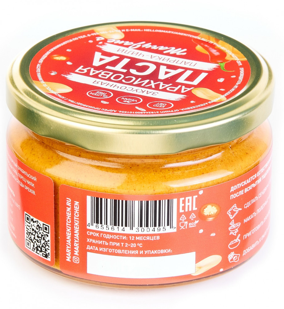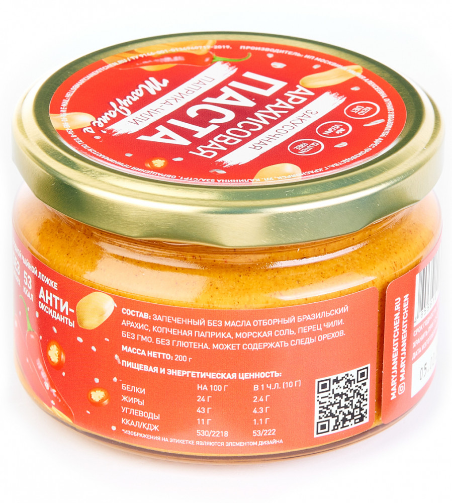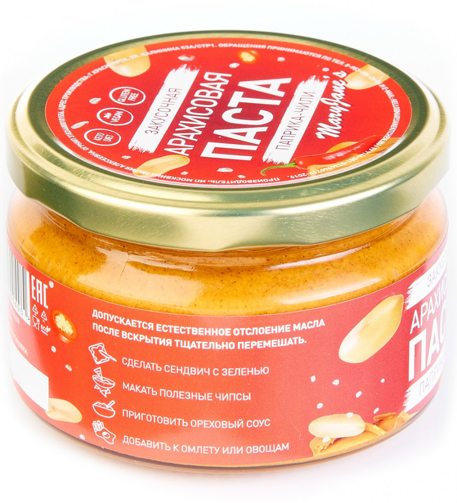 Закусочная паста с копченой паприкой и чили. Это полезная альтернатива чипсам и вредным закускам: откройте и почувствуйте невероятный запах ароматной копченой паприки, чили и арахиса. Острая паста прекрасно дополнит сытный бутерброд, омлет, овощной салат, будет очень вкусно попробовать с хрустящими треугольниками из лаваша, а так же станет основой орехового соуса для горячих блюд. Возможно естественное отслоение масла, при вскрытии рекомендуется перемешать. Вскрытую банку хранить в холодильнике.