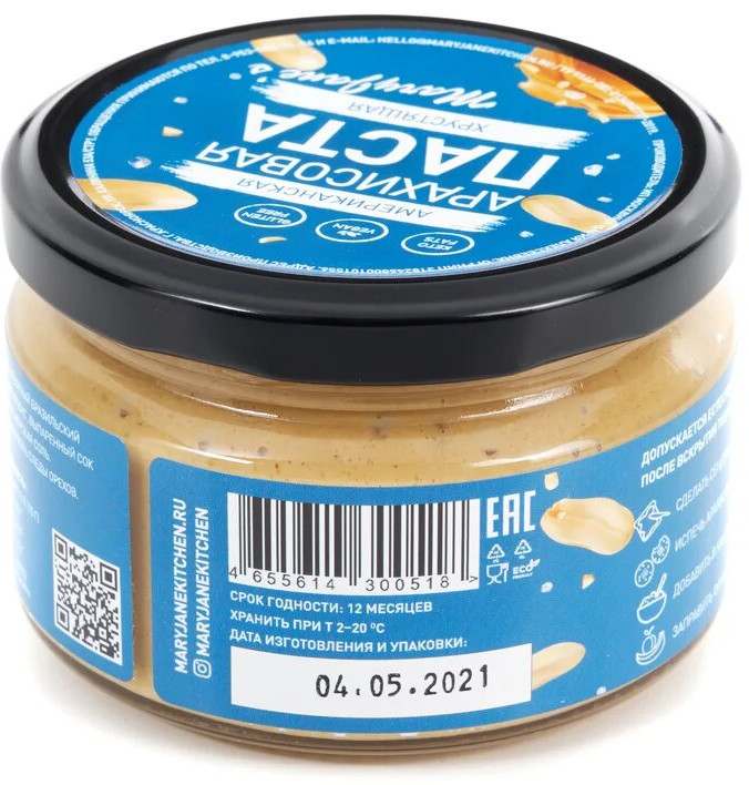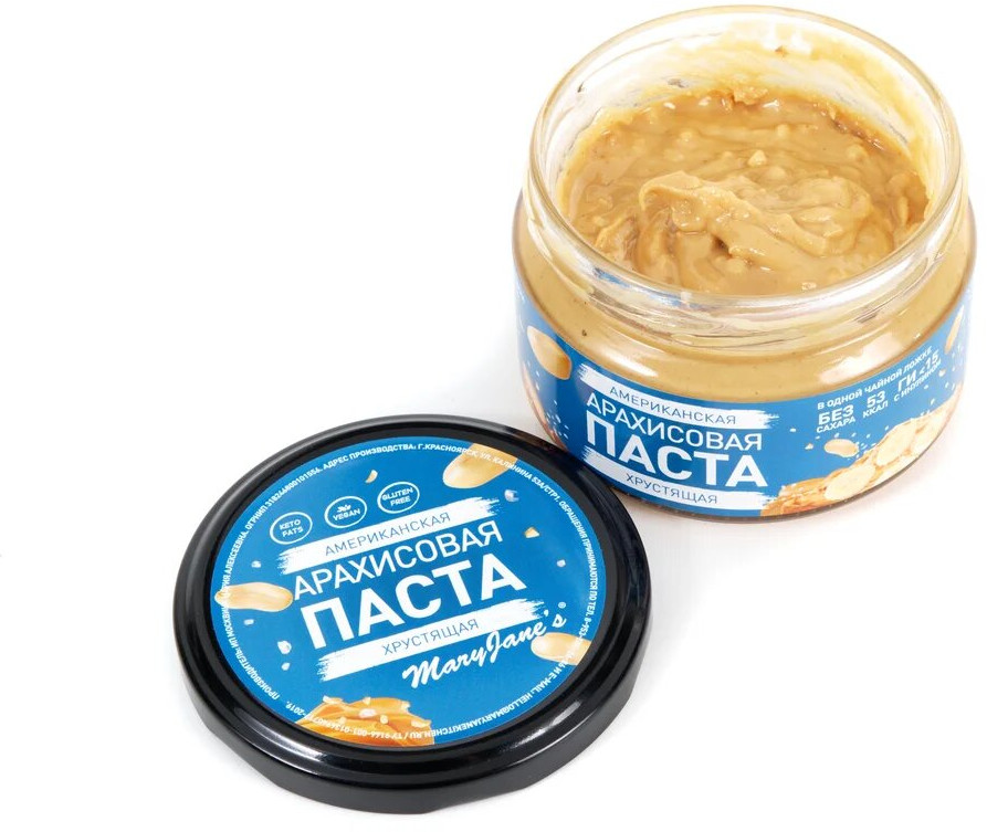 | Арахисовая паста Mary Jane’s Kitchen — без консервантов, наполнителей, подсластителей, эмульгаторов и других добавок или промышленных хитростей, имеет нежно-кремовую консистенцию и восхитительный натуральный вкус! Паста производится в Красноярске малыми партиями, только из свежих поставок сладких сортов арахиса, только из цельных орехов лучшего качества. |