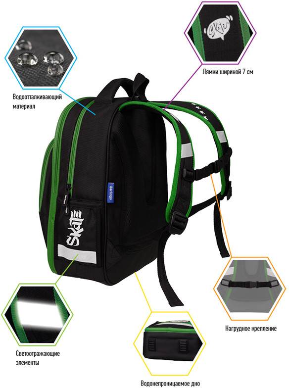Дно выполнено из водонепроницаемого материала с пластиковыми ножками для защиты от влаги. Ранец оснащен плотной ручкой и петлей для подвешивания. Световозвращающие элементы на передней части, сбоку и на лямках обеспечивают безопасность в темное время суток.