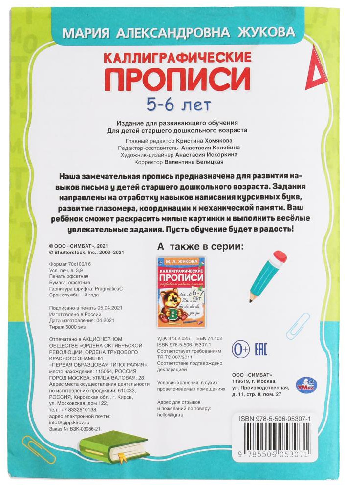 УМка Каллиграфические прописи. Готовим руку к письму, 5-6 лет