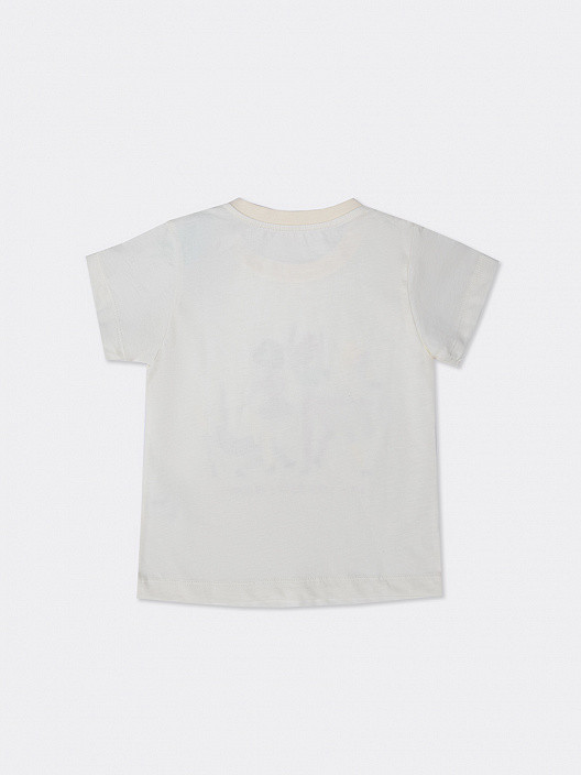 Футболка в молочном цвете на вид простенькая, думаю в белом цвете смотрелось бы гораздо лучше. К качеству ткани и пошиву претензий никаких, все сделано на совесть. Взяла размер 110 на рост 108, села впритык по длине. Нам нравится посвободнее, потому лучше бы подошел 116.