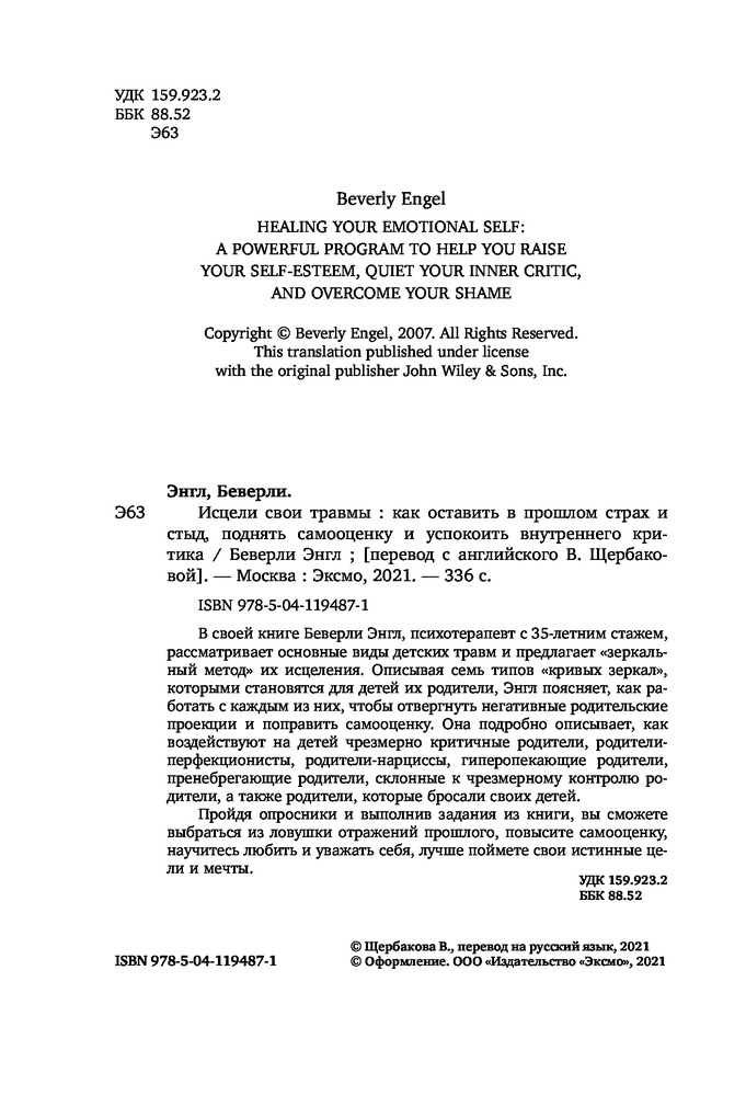 💳 Оплатить за товар можно при получении 🇰🇿 Есть бесплатная доставка по Казахстану 🎁 Копите бонусы с каждой покупки Серия: Исцели свои травмы. Авторская серия психолога Беверли Энгл В своей книге Беверли Энгл, психотерапевт с 35-летним стажем, рассматривает основные виды детских травм и предлагает «зеркальный метод» их исцеления. Описывая семь типов «кривых зеркал», которыми становятся для детей их родители, Энгл поясняет, как работать с каждым из них, чтобы отвергнуть негативные родительские проекции и поправить самооценку. Она подробно описывает, как воздействуют на детей чрезмерно критичные родители, родители-перфекционисты, родители-нарциссы, гиперопекающие родители, пренебрегающие родители, склонные к чрезмерному контролю родители, а также родители, которые бросали своих детей. |