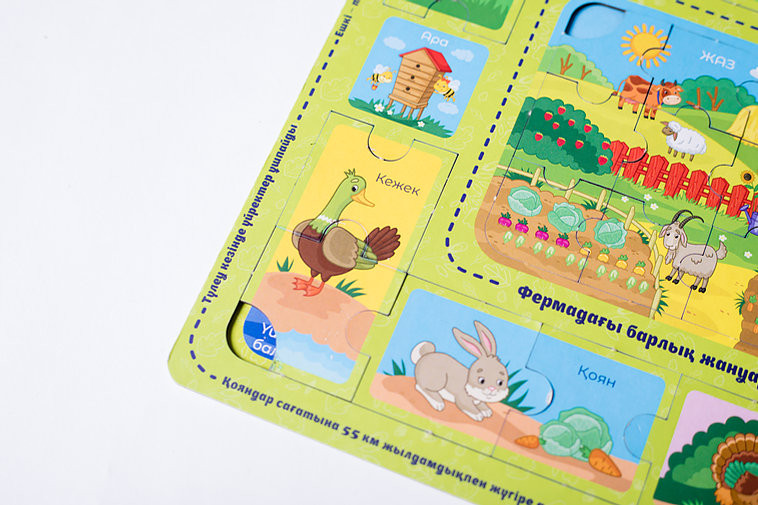 Серия: Дамытушы пазл Дамытушы пазл — балаларға арналған қызықты басқатырғыш-ойын! Пазлдың арқасында баланың логикалық ойлауы, қолының ұсақ моторикасы және қиялы дамиды. Жинақта барлығы 41 бөлшек, оның ішінде фермада тіршілік ететін жануарлардың 20 жұп пазл бар. Бала оларды ашқанда сиыр, доңыз және тағы басқа жануарлардың төлдерімен танысады. Ортадағы пазлды бөлшектеп немесе жинай отырып, жаздан кейін қай мезгіл келетінін біледі. |