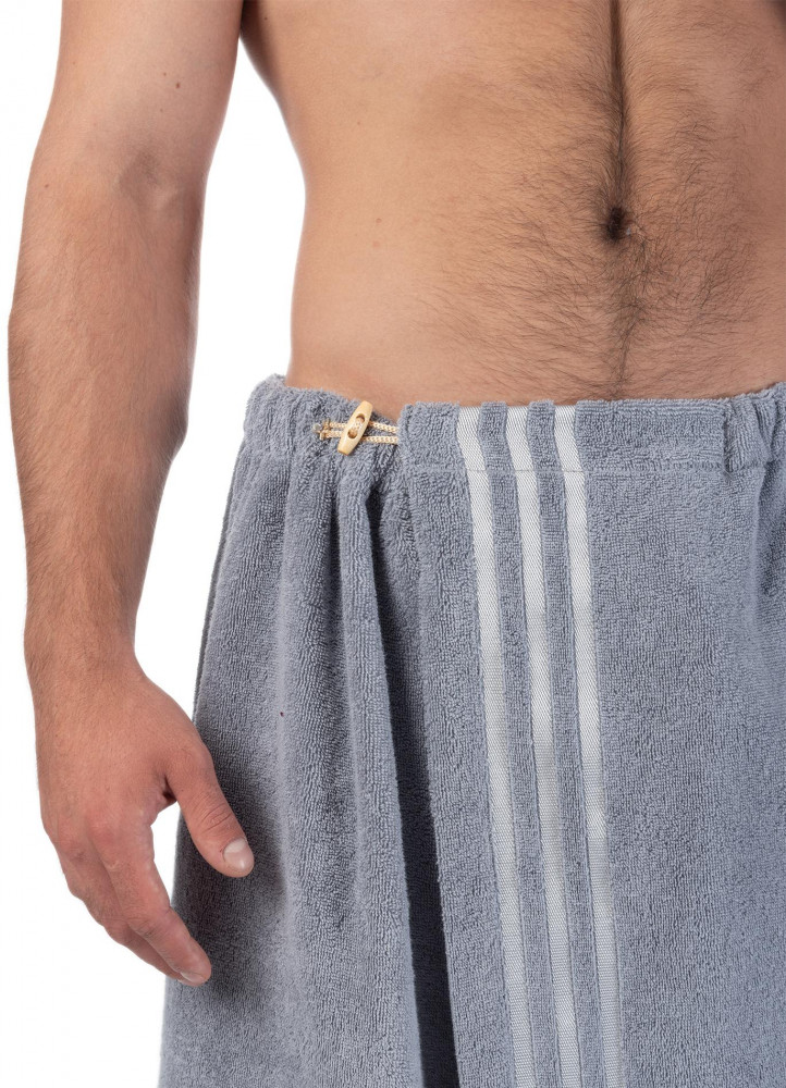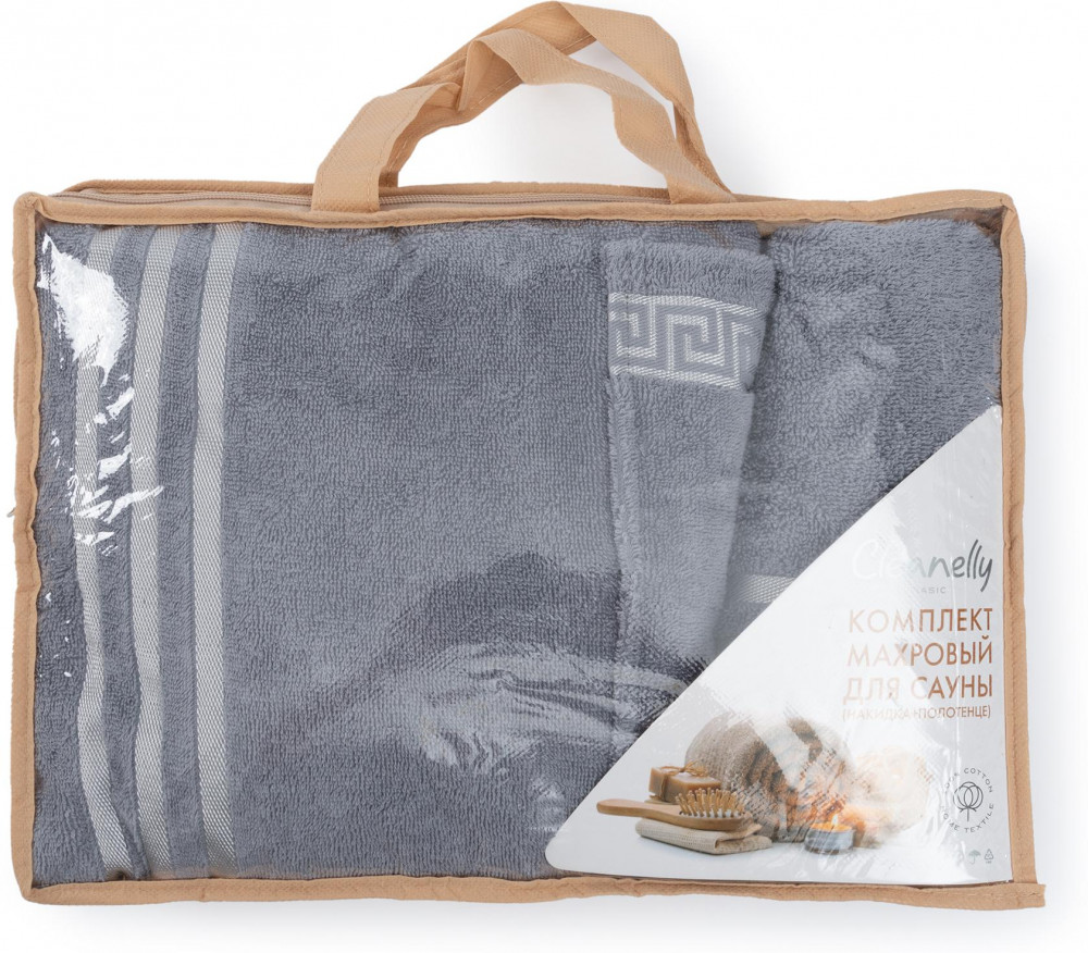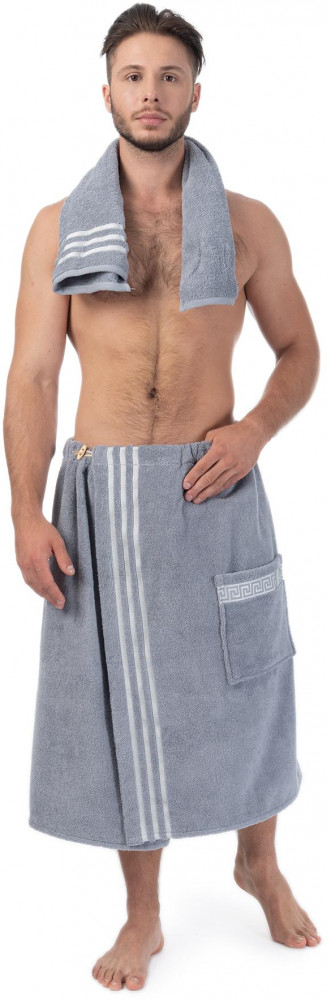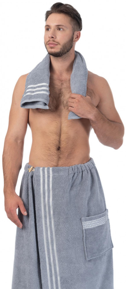 Орнамент меандр с тысячелетней историей до сих пор удивляет уникальностью. Непрерывная линия с повторяющимися изгибами символизирует течение жизни, время, бесконечность. Древние считали орнамент языком самой природы, а современники называют его языком времени. Бордюр с узором меандр украшает карман накидки из комплекта для сауны Apollo. Рисунок передан серебристой полиэфирной нитью на махровой ткани серого цвета. Древнегреческий рисунок привлекает внимание к изделию и создает особый притягательный образ вместе с серебристыми полосами в боковом бордюре. Накидку дополняет полотенце для лица с аналогичными полосками.