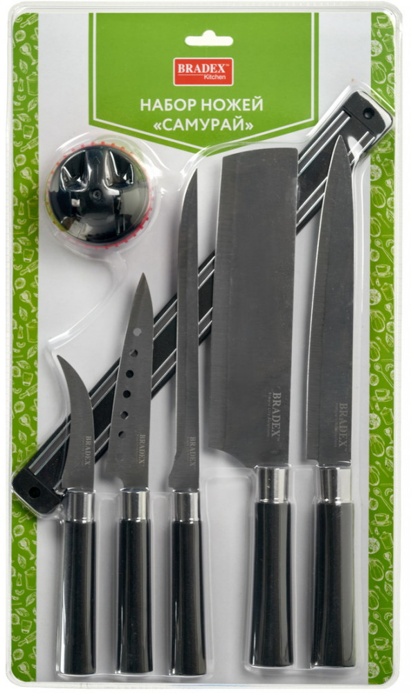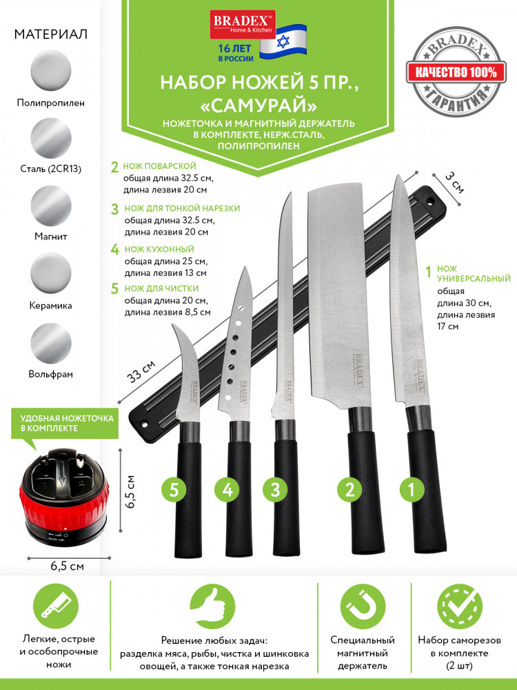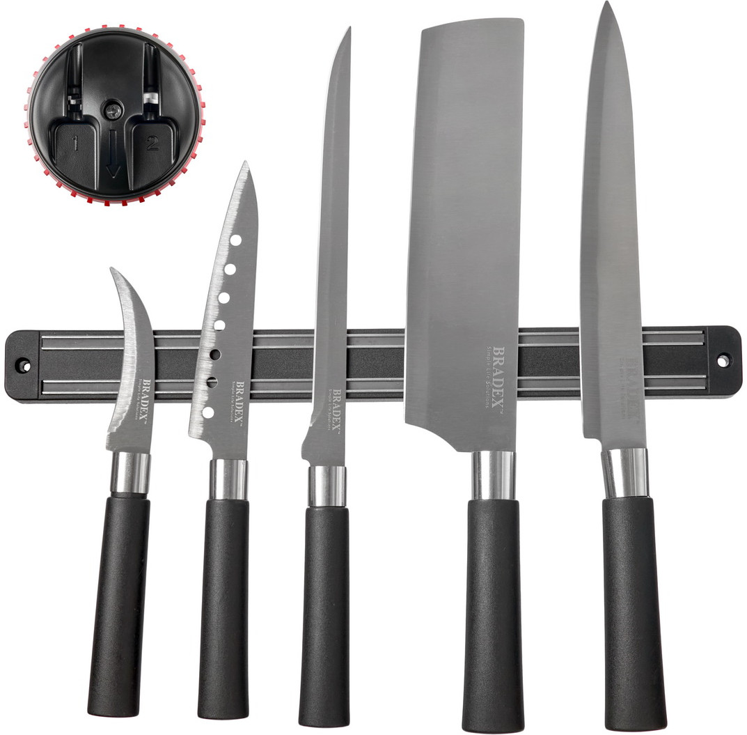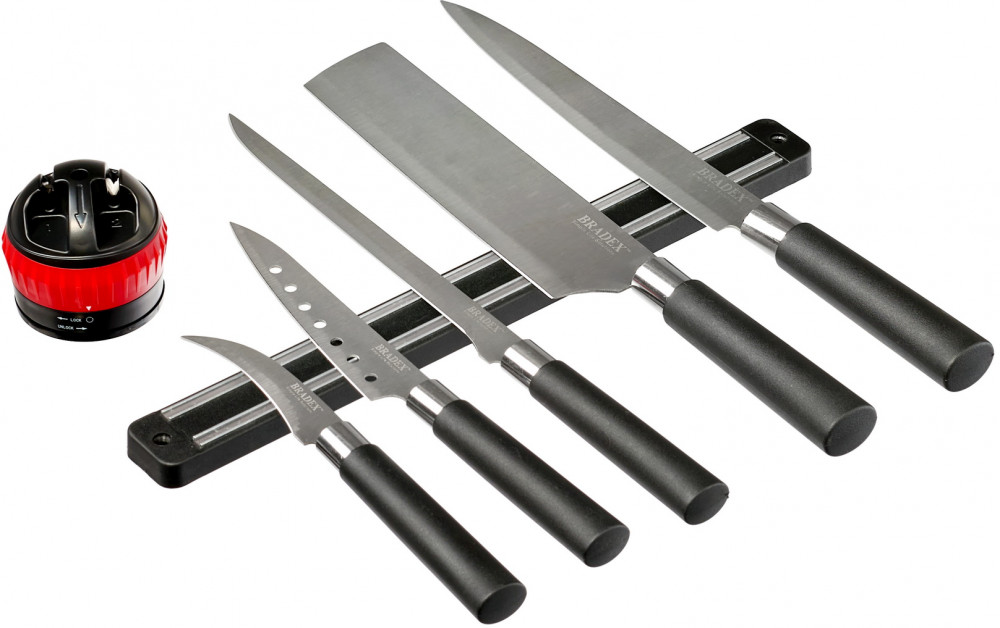 Держатель магнитный позволяет удобно закрепить ножи на стене, легко снимать и возвращать их на место во время работы. Долговечная ножеточка из вольфрама и керамики позволит вовремя и без особых усилий заточить ножи.