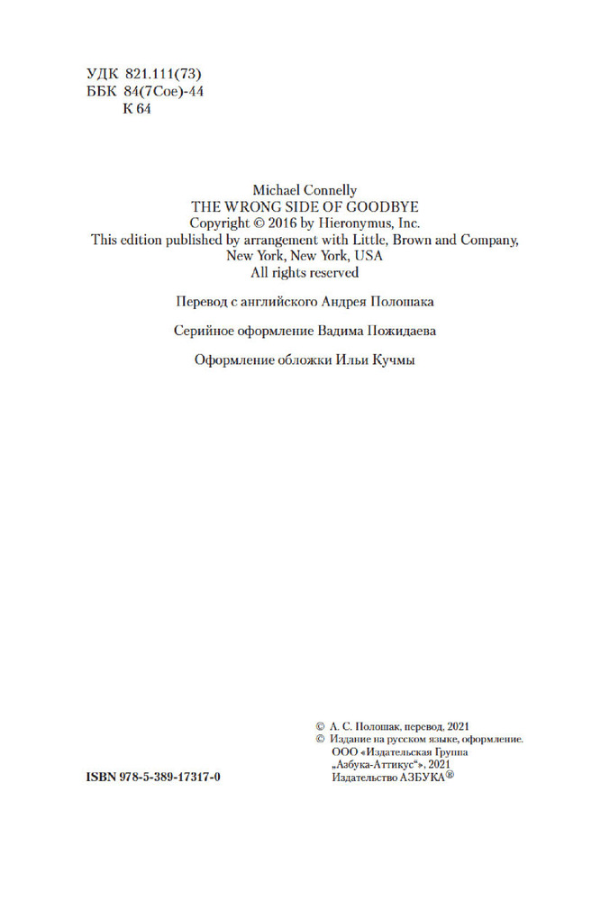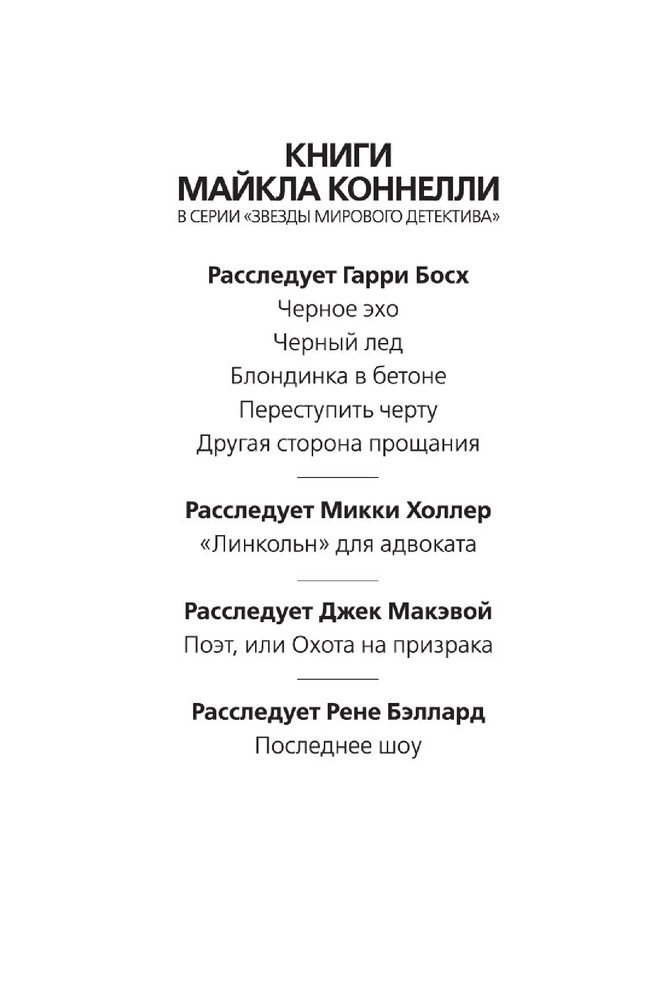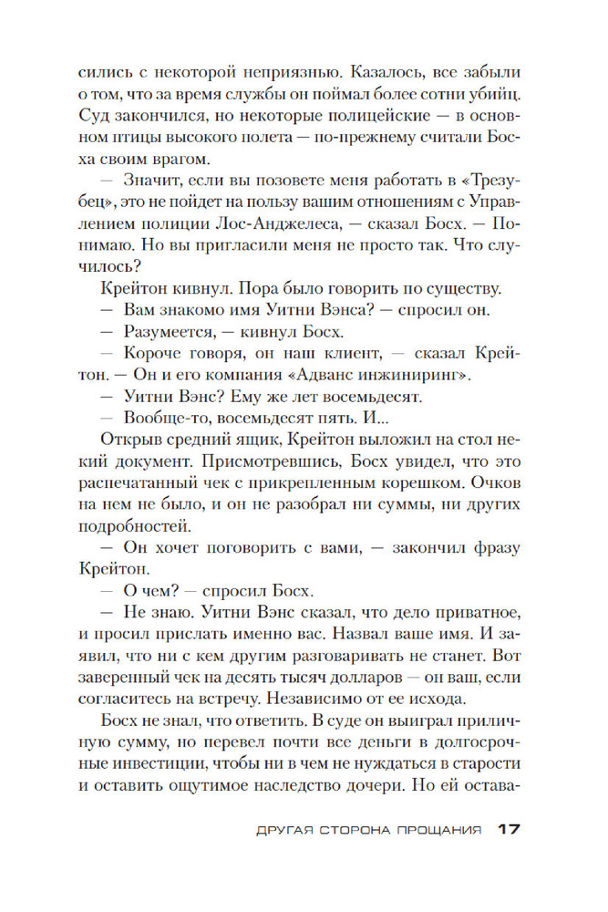 Другая сторона прощанияВ данный момент этот товар отсутствует в продаже. Возможно, у нас найдется аналогичный или похожий товар здесь. Серия: Звезды мирового детектива (обложка) Одинокий старик-миллиардер понимает, что дни его сочтены. Он многого добился в этой жизни и мог бы умереть спокойно, но одно воспоминание, смешанное с чувством сожаления, преследует его. Когда-то он, калифорнийский богатый юнец, встретил мексиканскую девушку. Она забеременела, но вскоре исчезла. Родился ли у нее ребенок? И если да, то что с ним случилось? Отчаявшись узнать, есть ли у него наследник, умирающий магнат нанимает детектива Гарри Босха — единственного человека, которому он может доверять. На карту поставлено огромное состояние, и Босху ясно, какой опасности подвергается и он сам, и тот, кого он ищет. И вот детективу удается нащупать след... Эта история мистическим образом перекликается с его собственным прошлым. Теперь Босх не успокоится, пока не узнает всю правду...  |