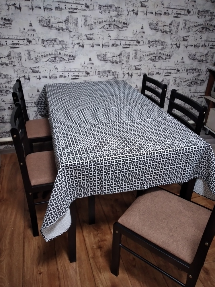 Скатерть понравилась, приходит в упаковке, хорошо простроченна. Пока новая держит форму, дальше после стирки будет видно. Размер соответствует заявленному ( брала 150×180), размер моего стола 140×80. Мне понравилась, домашнии сказали , что ребит в глазах))